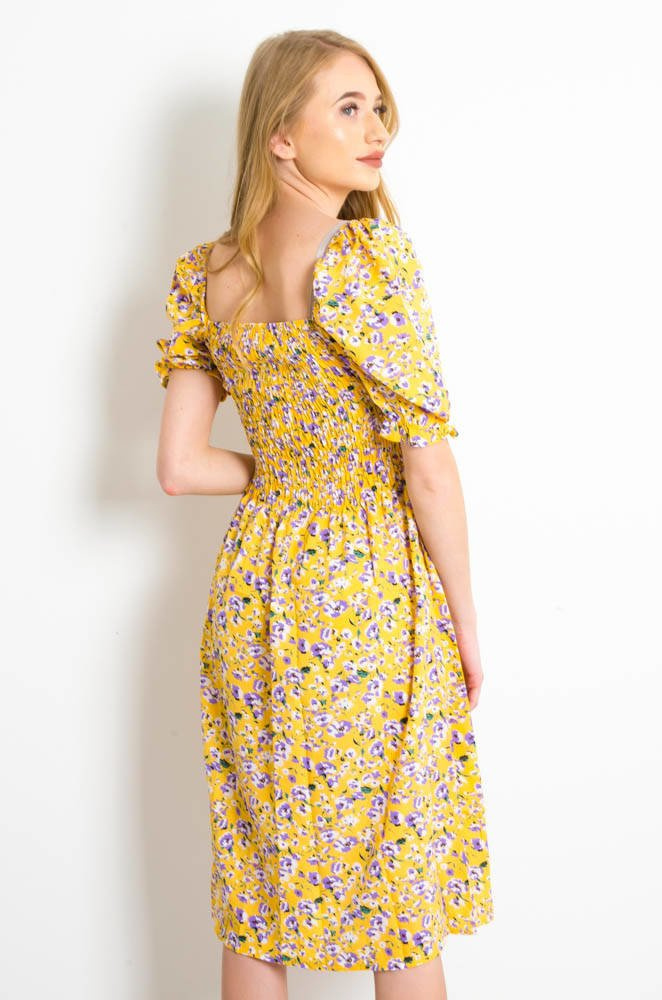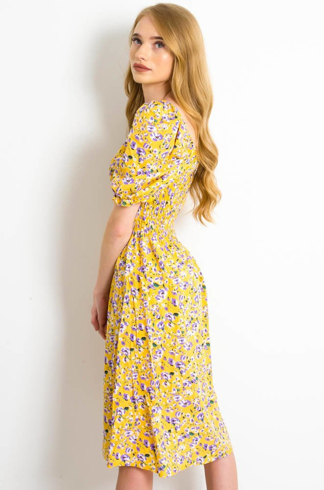ŻÓŁTA SUKIENKA Z BUFKAMI W DROBNE FIOLETOWE KWIATY