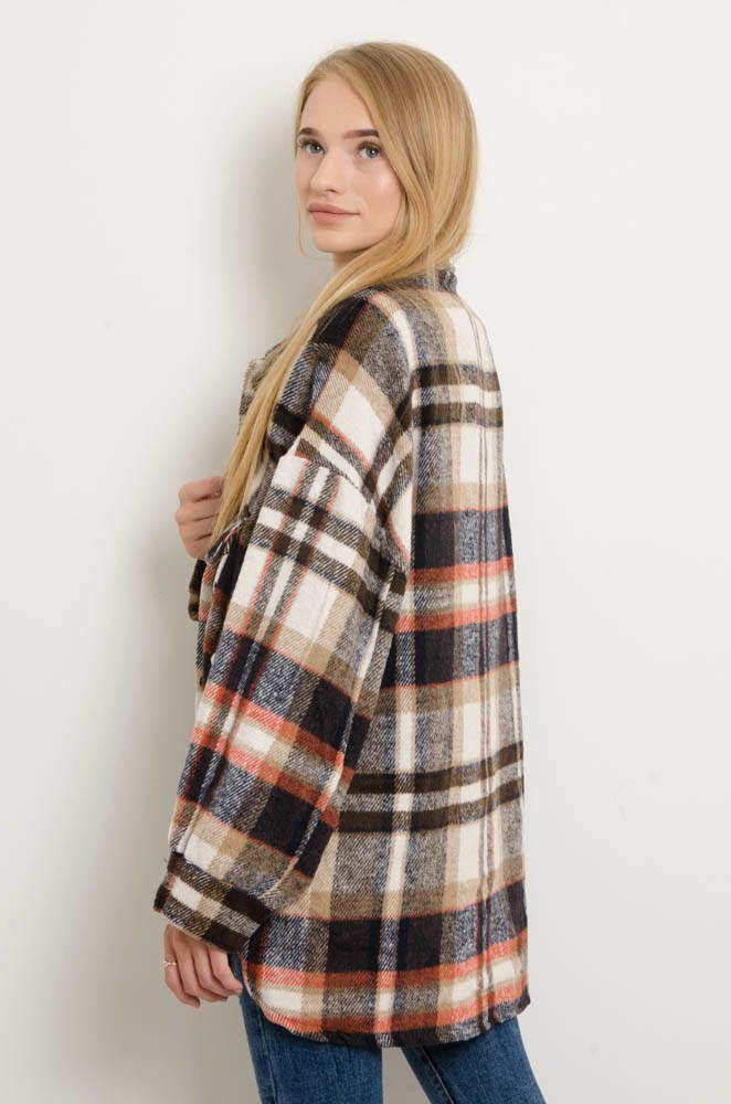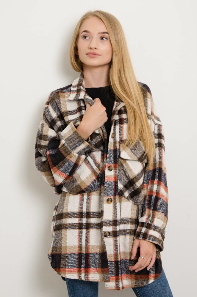 KURTKA KOSZULOWA W KRATĘ - BRĄZOWA