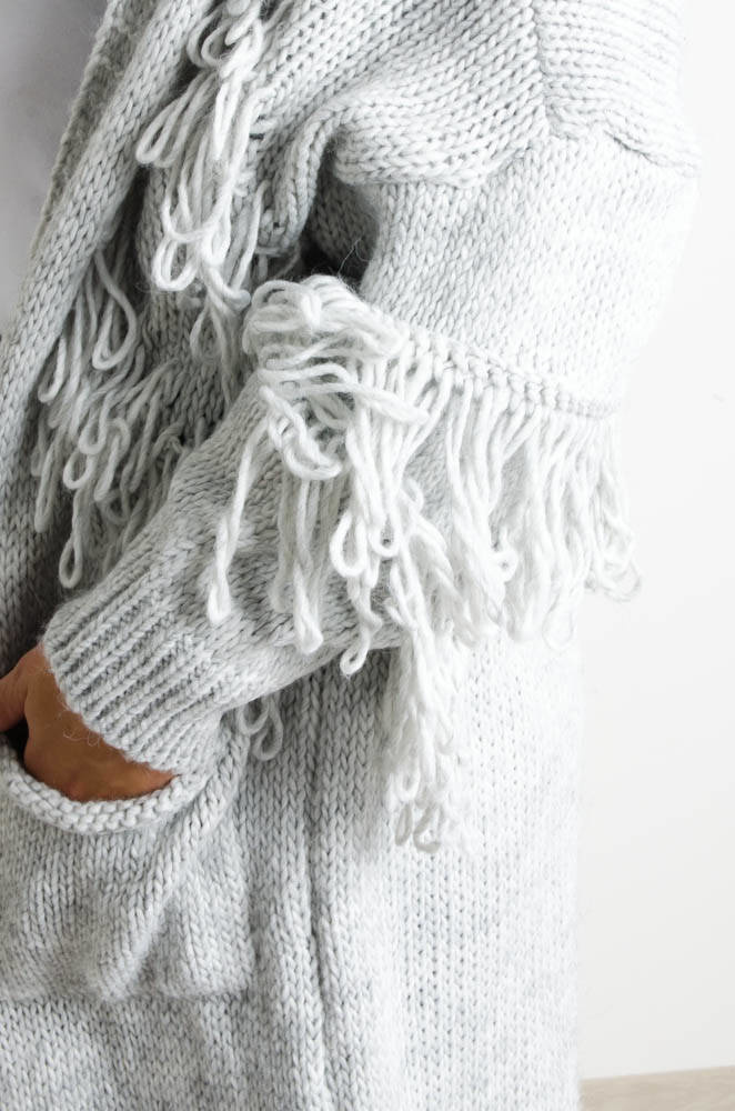 SZARY SWETER KARDIGAN Z FRĘDZLAMI