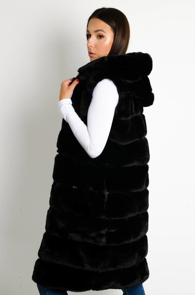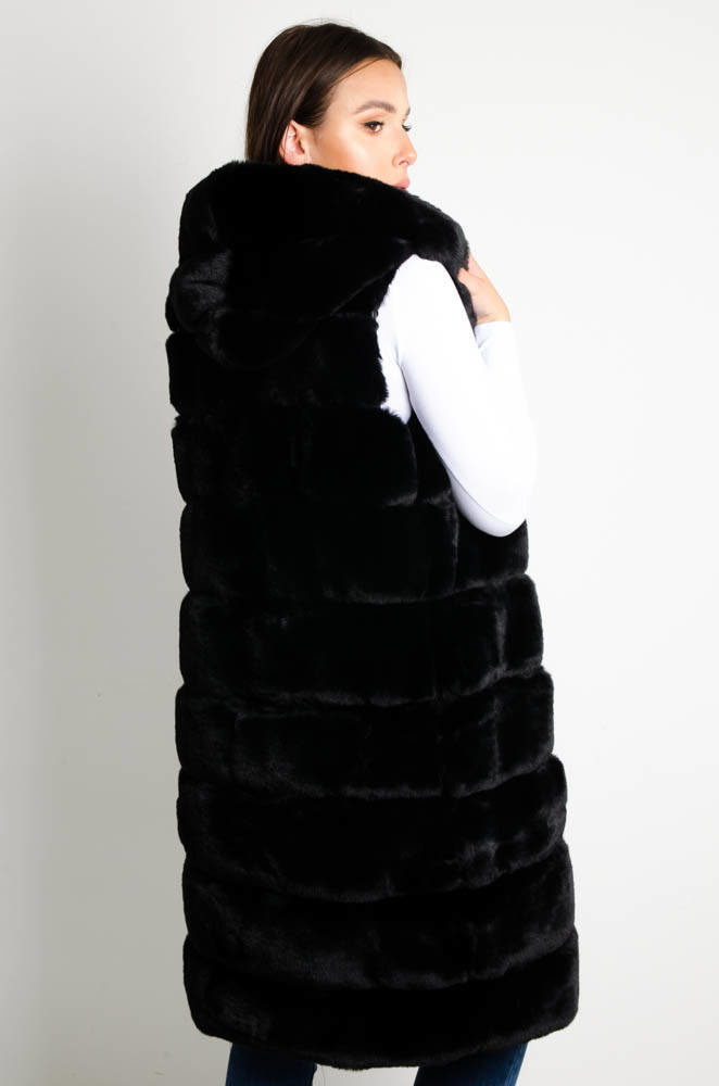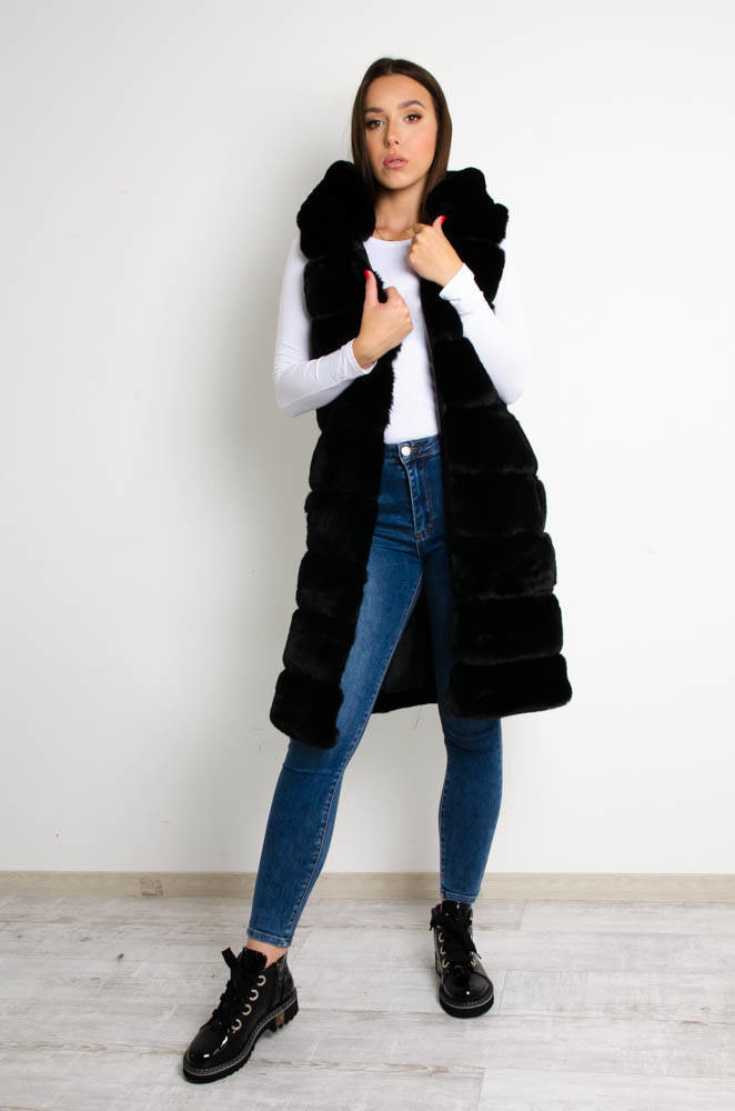 DŁUGA CZARNA FUTRZANA KAMIZELKA Z KAPTUREM