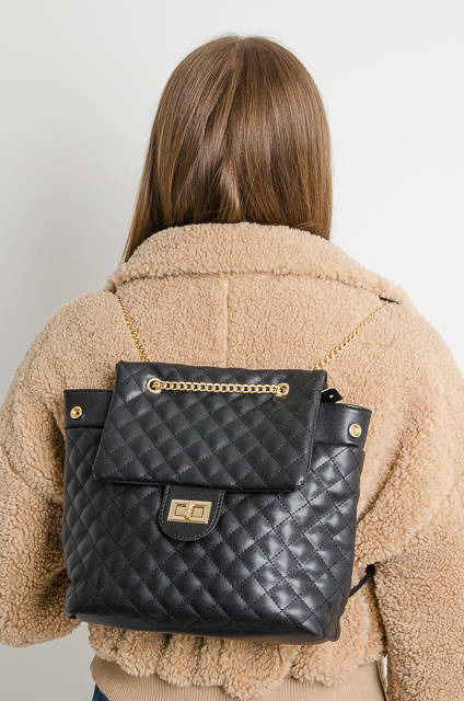 CZARNA PIKOWANA TOREBKA-PLECAK ZE ZŁOTYM ŁAŃCUSZKIEM