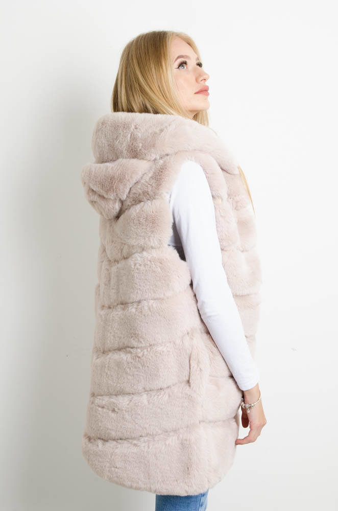 BEŻOWA FUTRZANA KAMIZELKA Z KAPTUREM