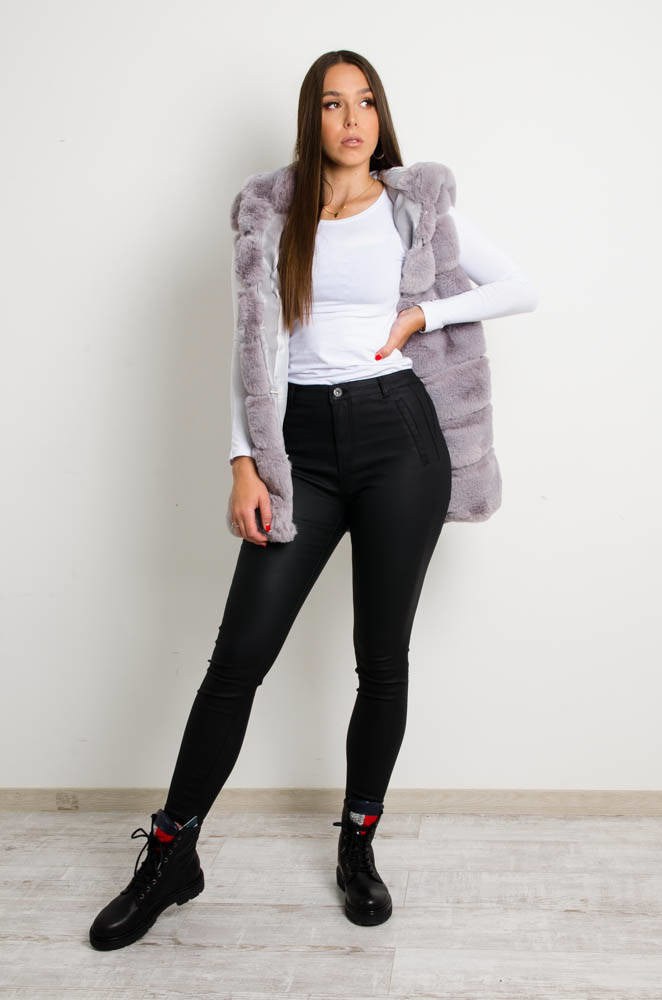 SZARA FUTRZANA KAMIZELKA Z KAPTUREM