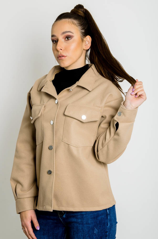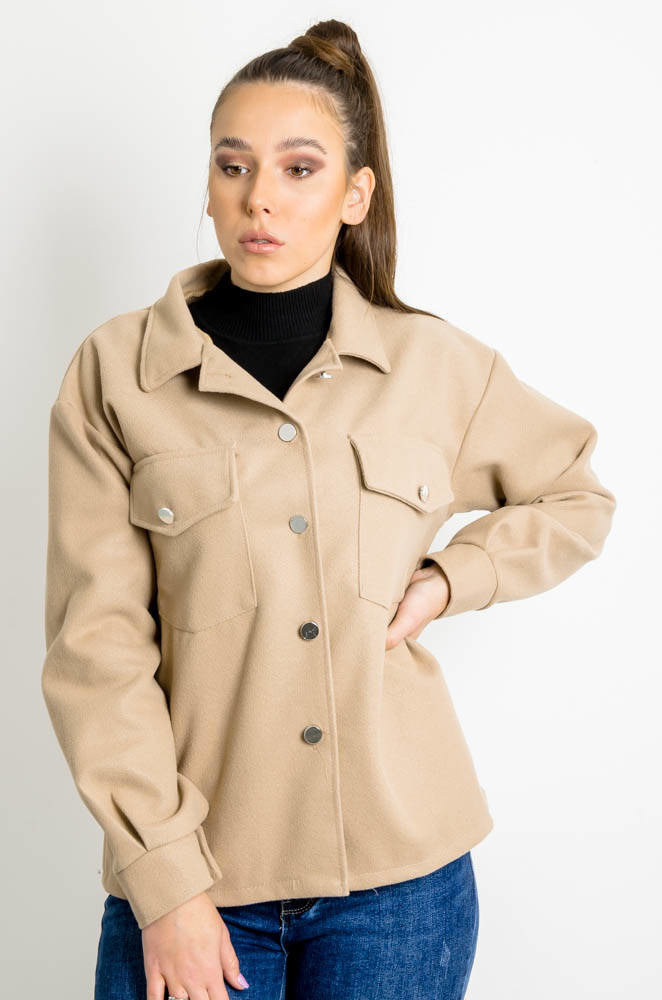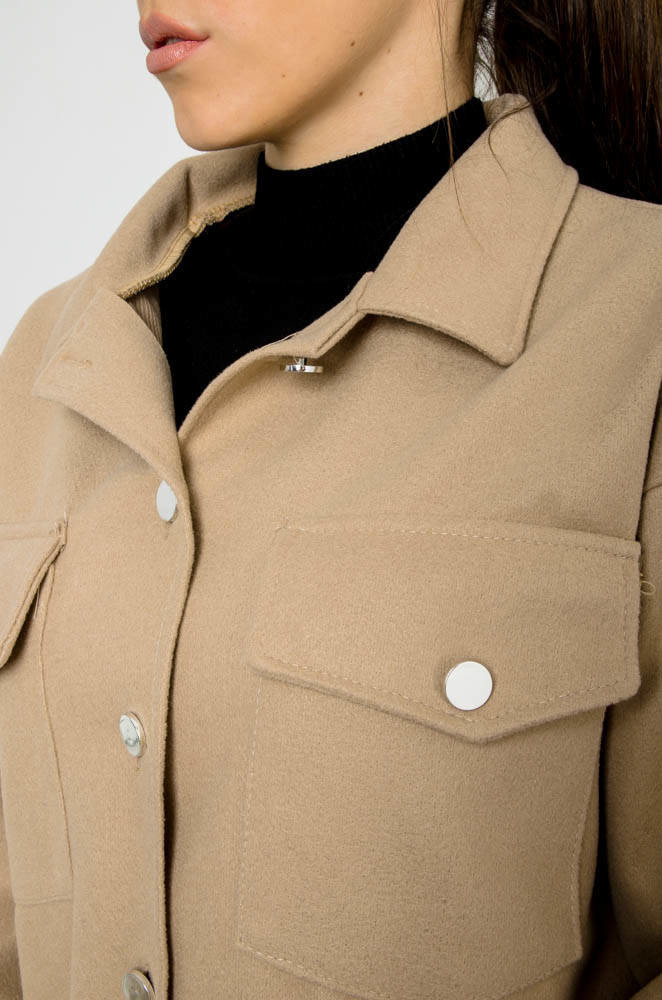BEŻOWY KRÓTKI PŁASZCZ ZAPINANY NA GUZIKI Z KIESZENIAMI