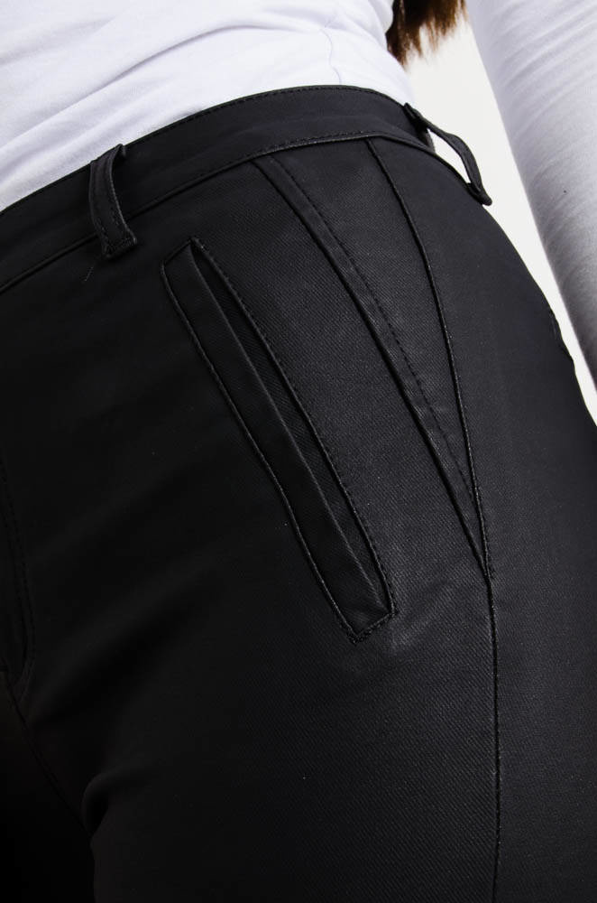 Spodnie woskowane z funkcją modelowania, trzymają i podkreślają talię, uda i pośladki oraz zachowują kształt. Wysoki stan, rozporek na suwak i guzik. Obcisłe nogawki. Imitacja kieszeni z przodu i z tyłu.