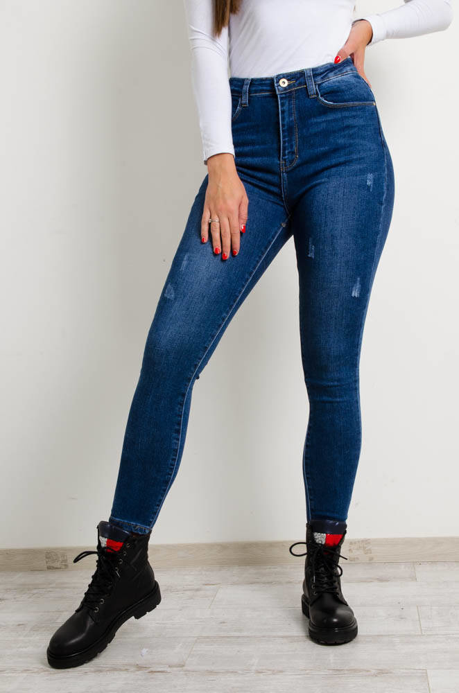 CIEMNE SPODNIE JEANSOWE Z PRZETARCIAMI-WYSOKI STAN