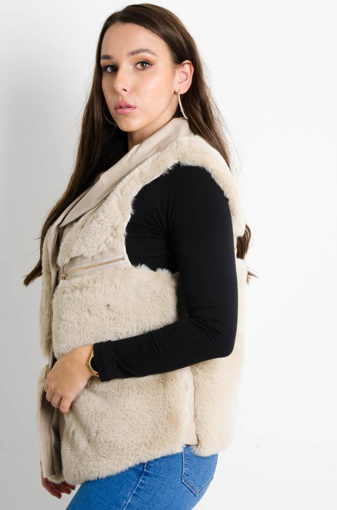 BEŻOWA FUTRZANA KAMIZELKA ZE WSTAWKAMI Z EKOSKÓRY