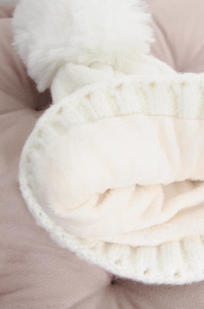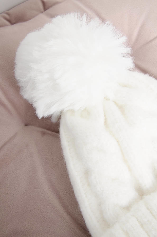 BIAŁA ZIMOWA CZAPKA PLECIONA Z POMPONEM