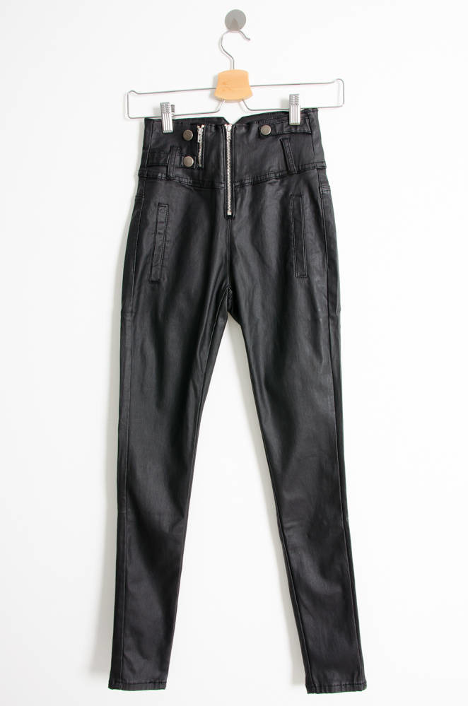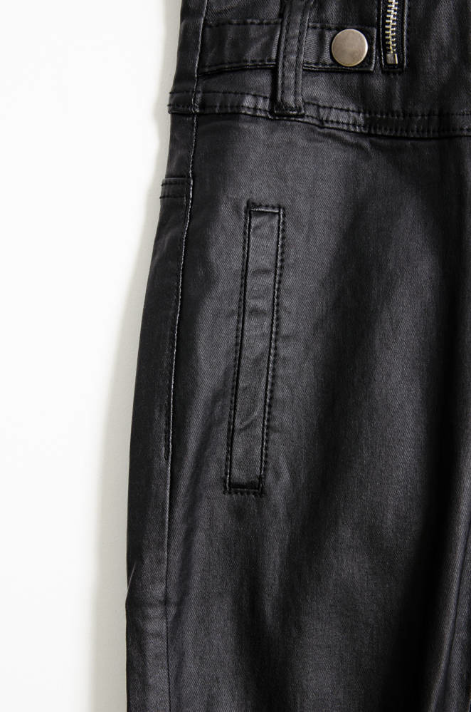Spodnie woskowane z funkcją modelowania, trzymają i podkreślają talię, uda i pośladki oraz zachowują kształt. Bardzo wysoki stan, rozporek na suwak Obcisłe nogawki. Ozdobne guziki i suwak.