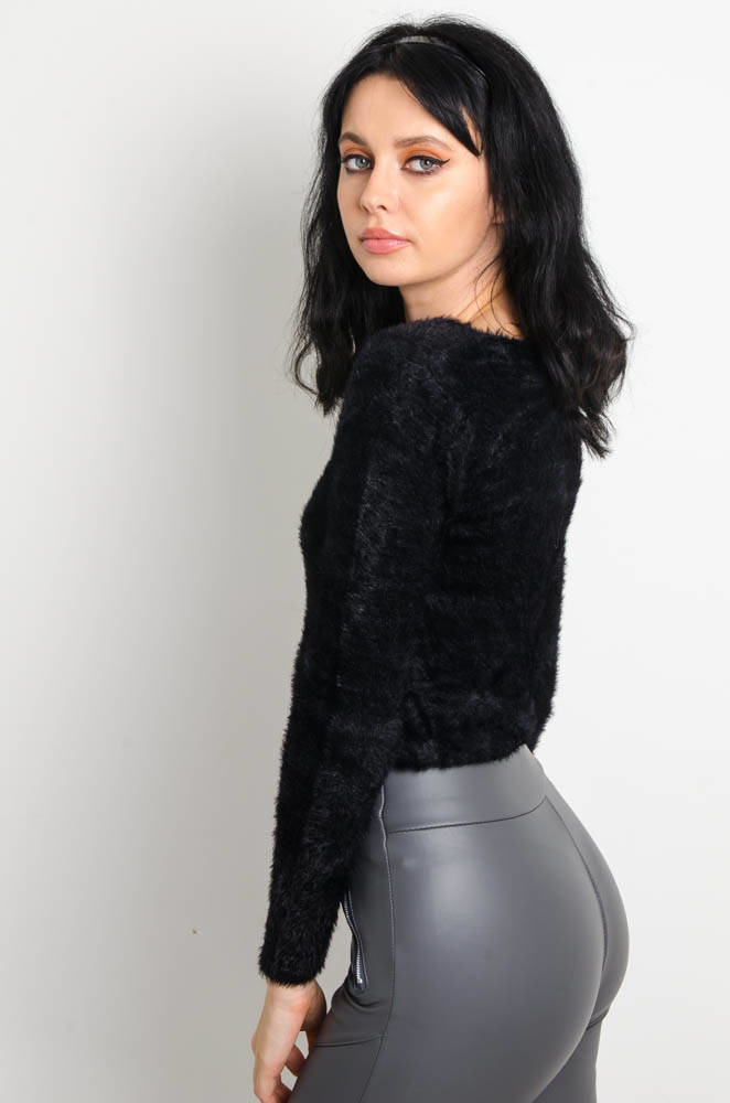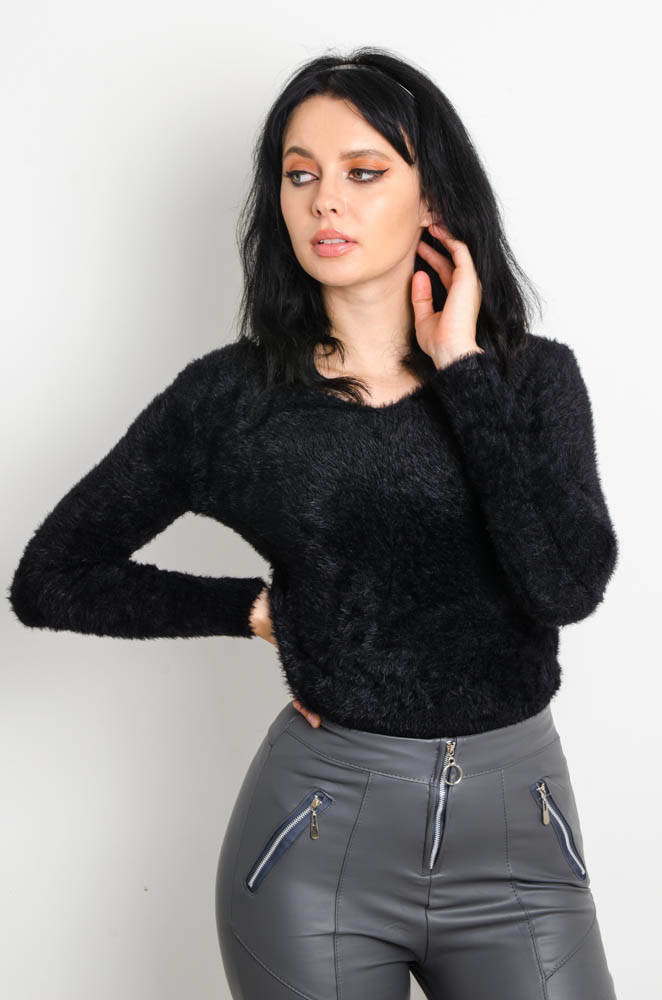 CZARNY WŁOCHATY SWETEREK Z DEKOLTEM W SEREK