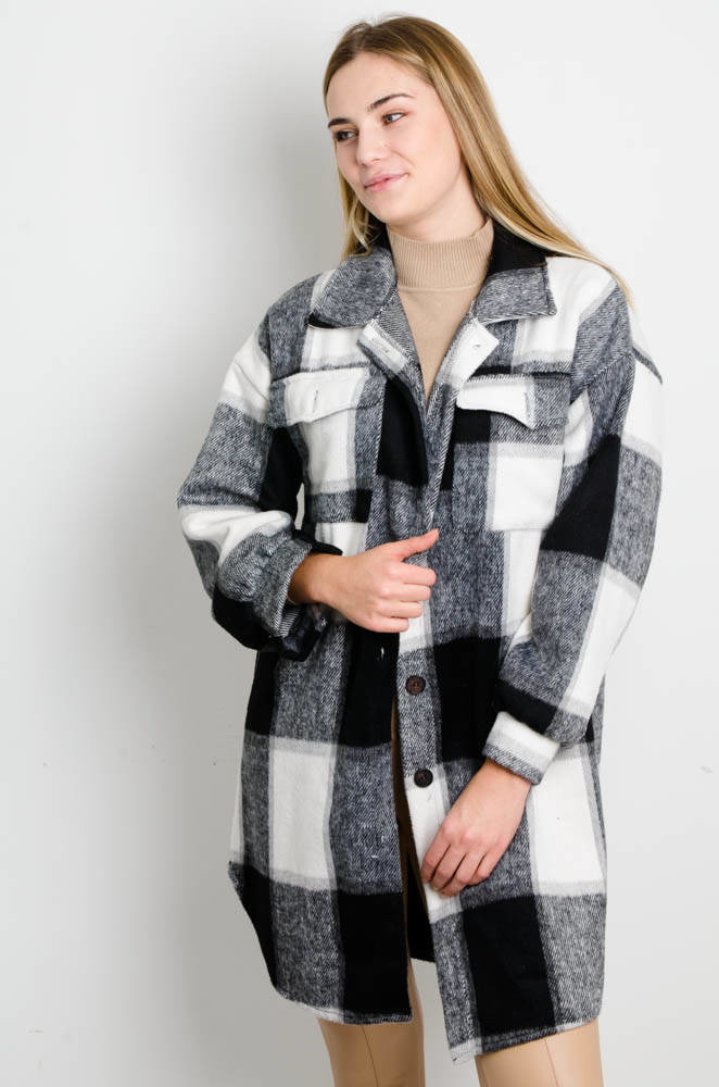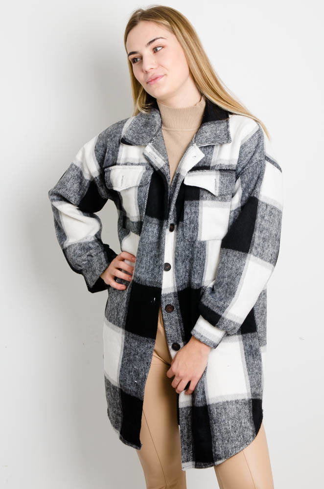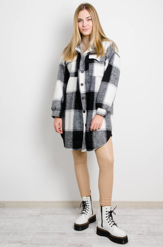 CZARNO-BIAŁY PŁASZCZ KOSZULOWY W KRATĘ