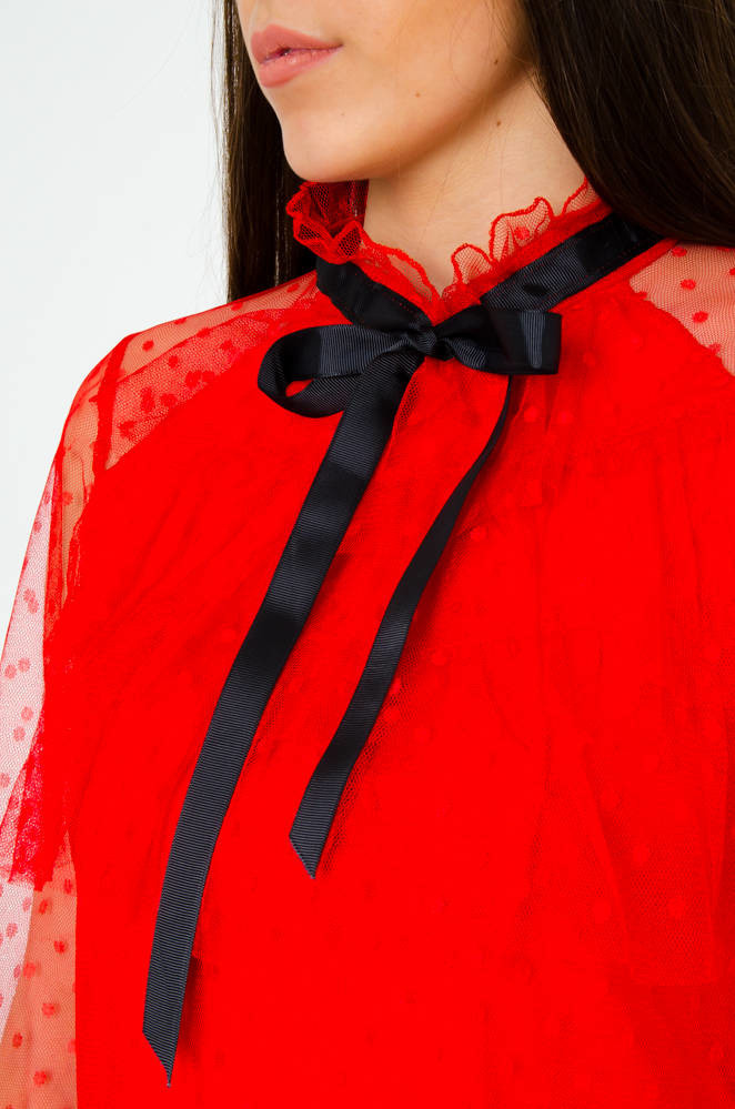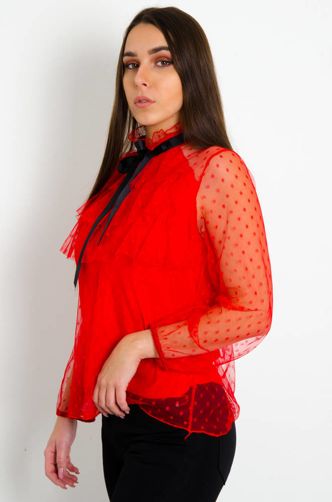 CZERWONA TIULOWA BLUZKA W KROPKI Z WIĄZANIEM