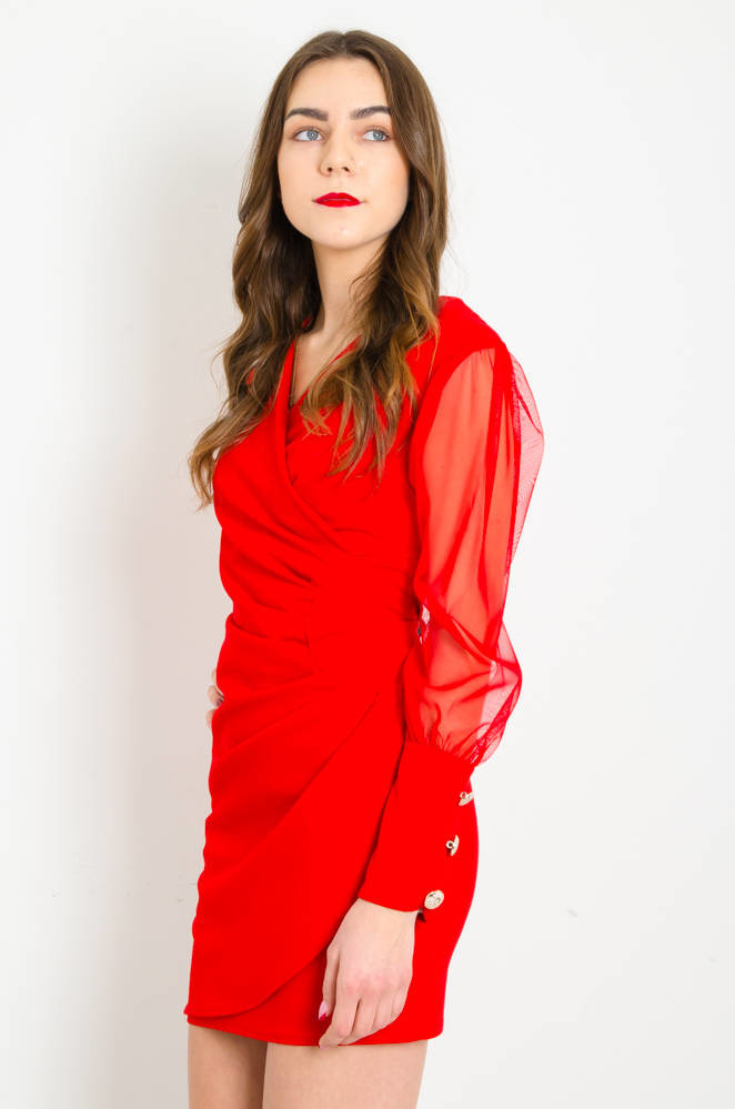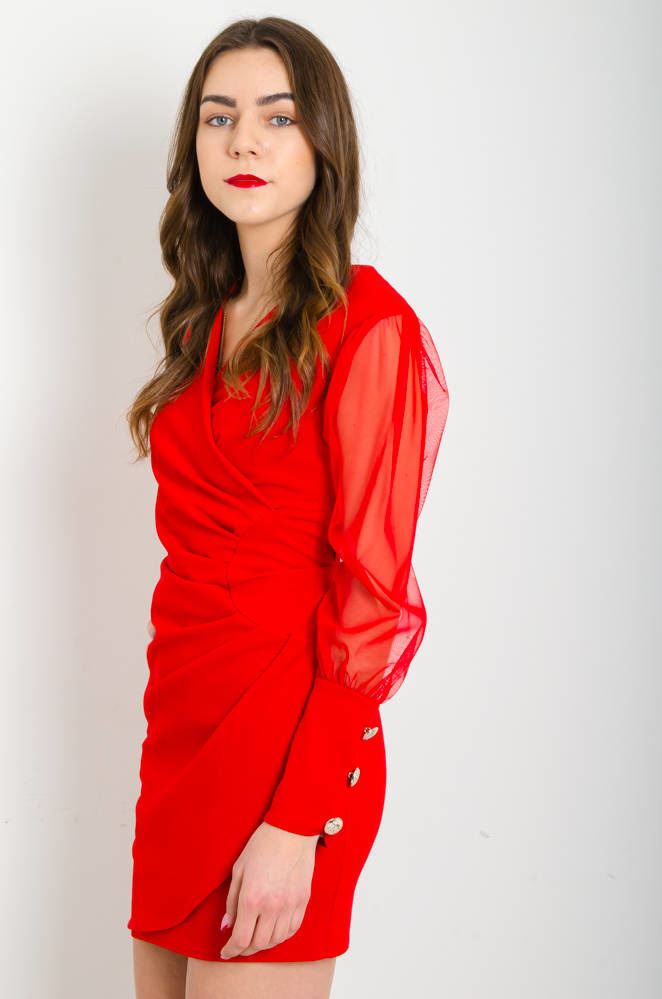 CZERWONA KOPERTOWA SUKIENKA Z TIULOWYMI RĘKAWAMI