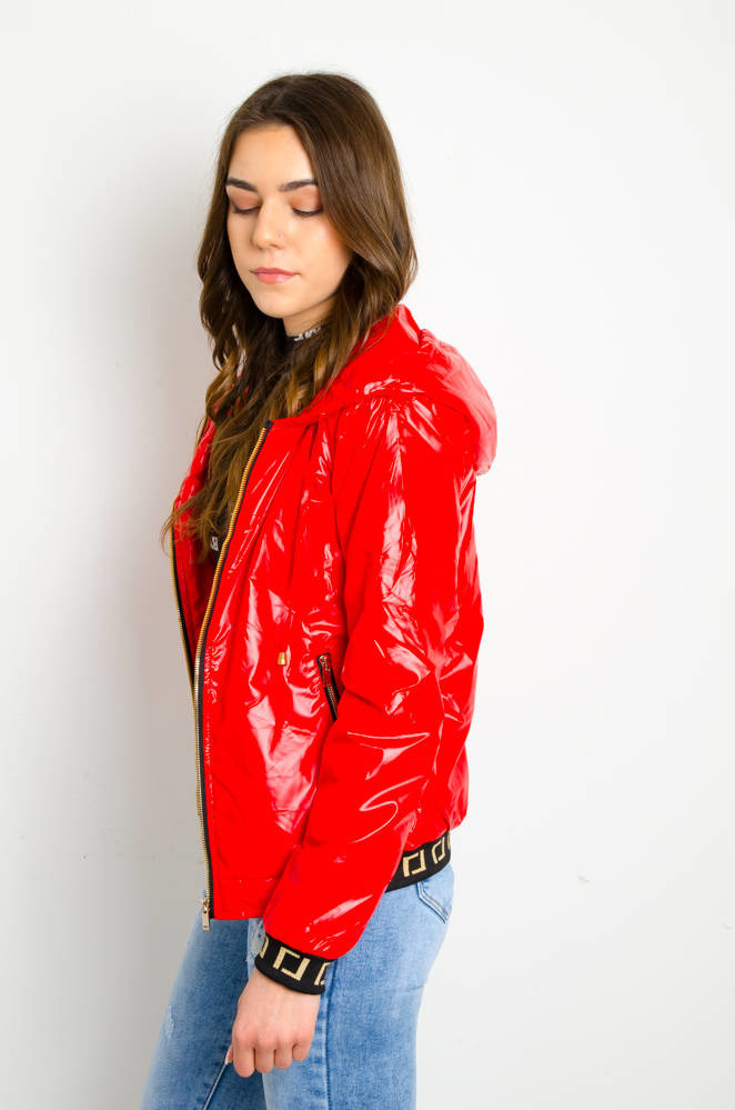 CZERWONA POŁYSKUJĄCA KURTKA WIOSENNA Z KAPTUREM