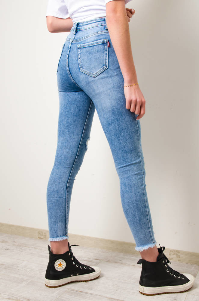 Jeansy z funkcją stretchu, który trzyma i modeluje talię, uda i pośladki oraz zachowuje kształt jeansów. Wysoki stan, rozporek na suwak i guzik. Obcisłe nogawki z przetarciami.