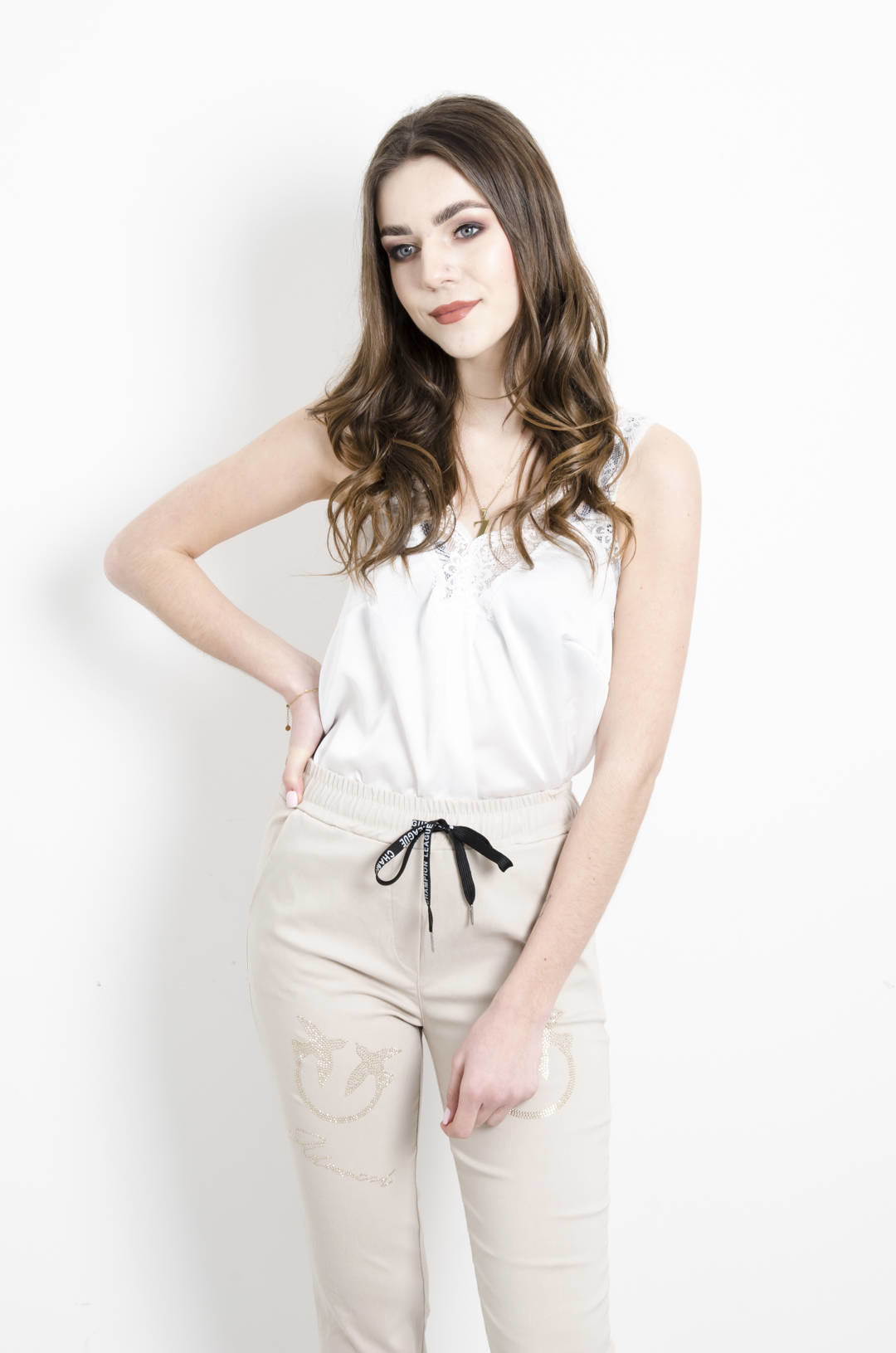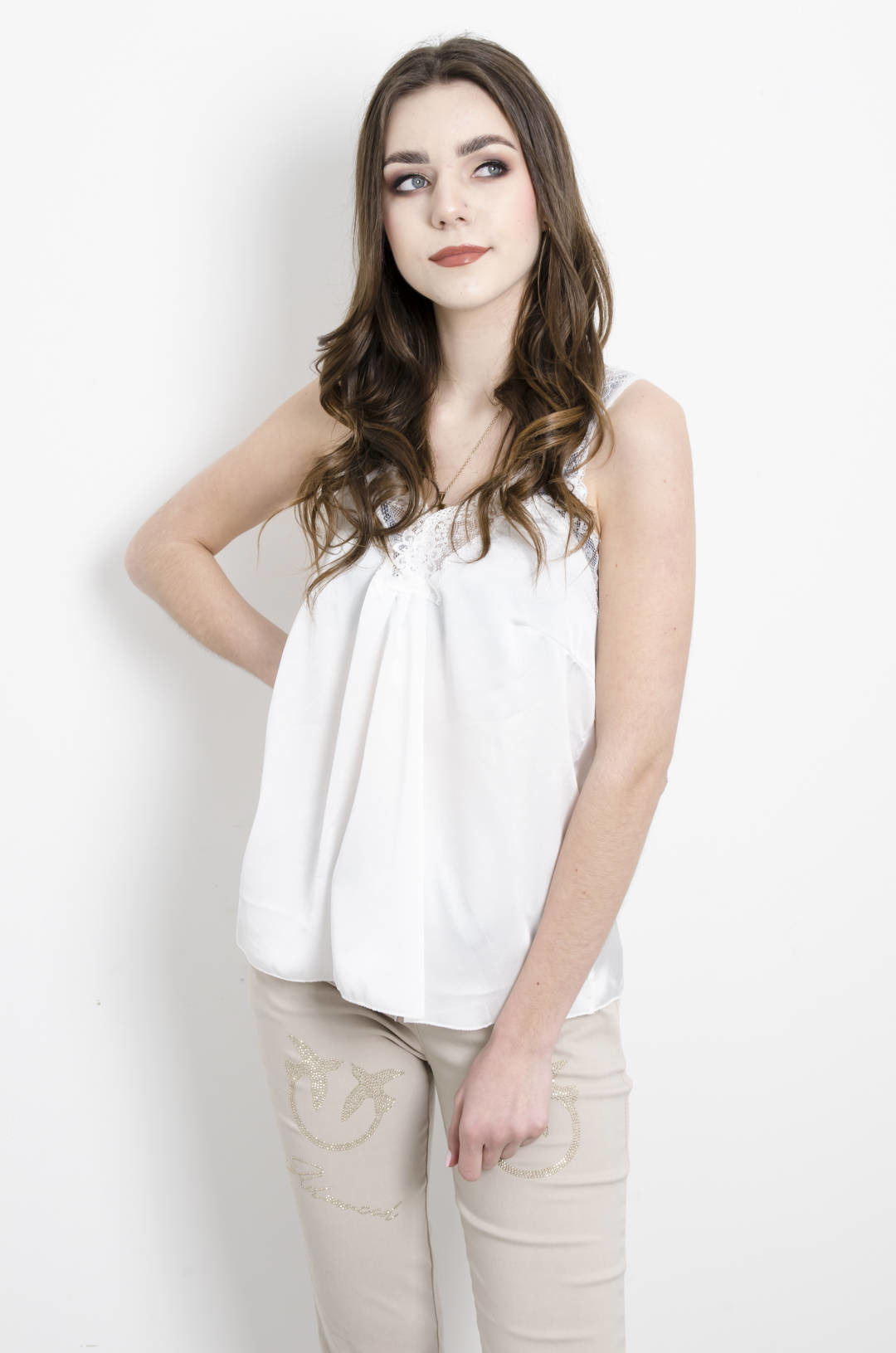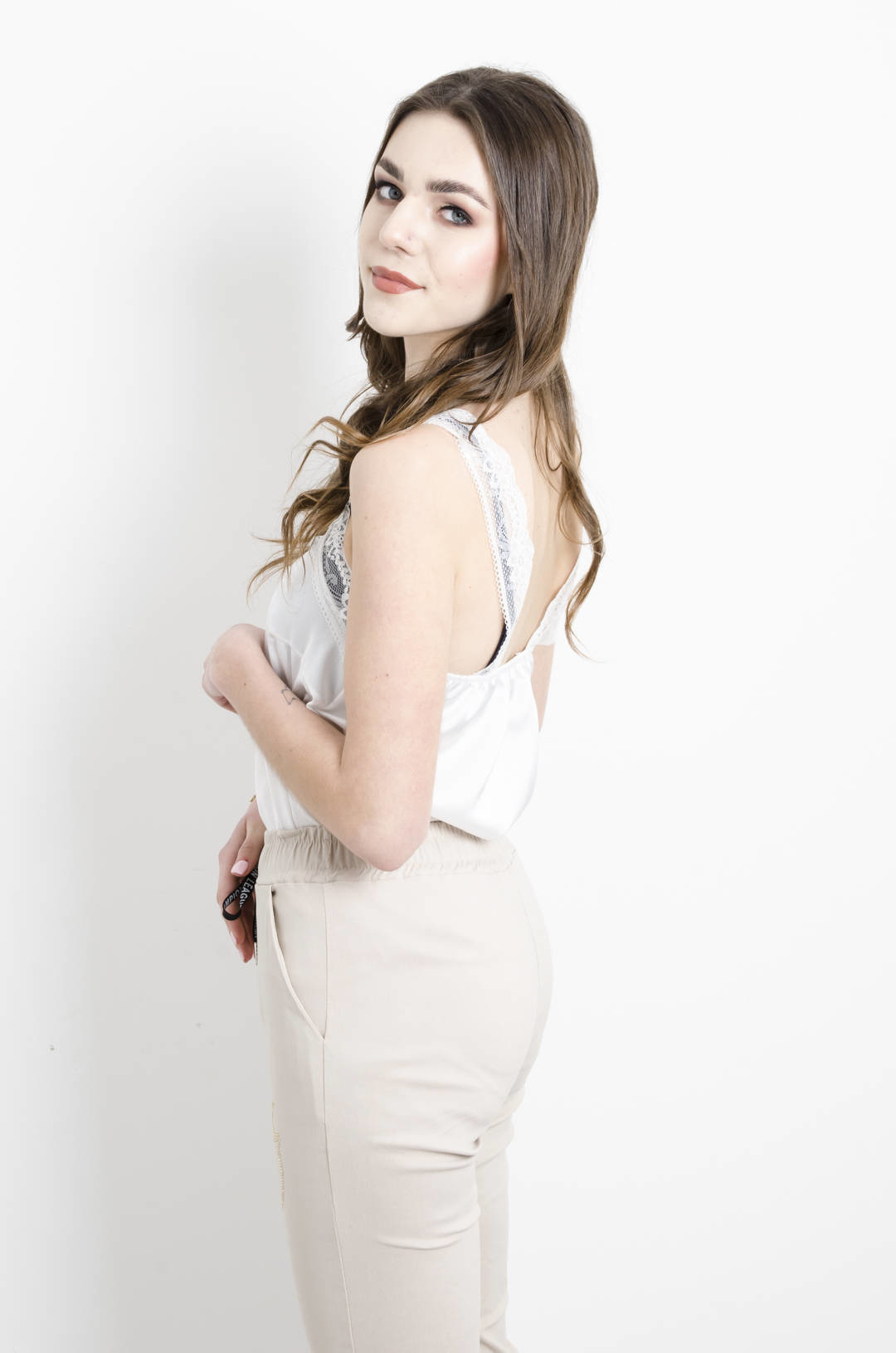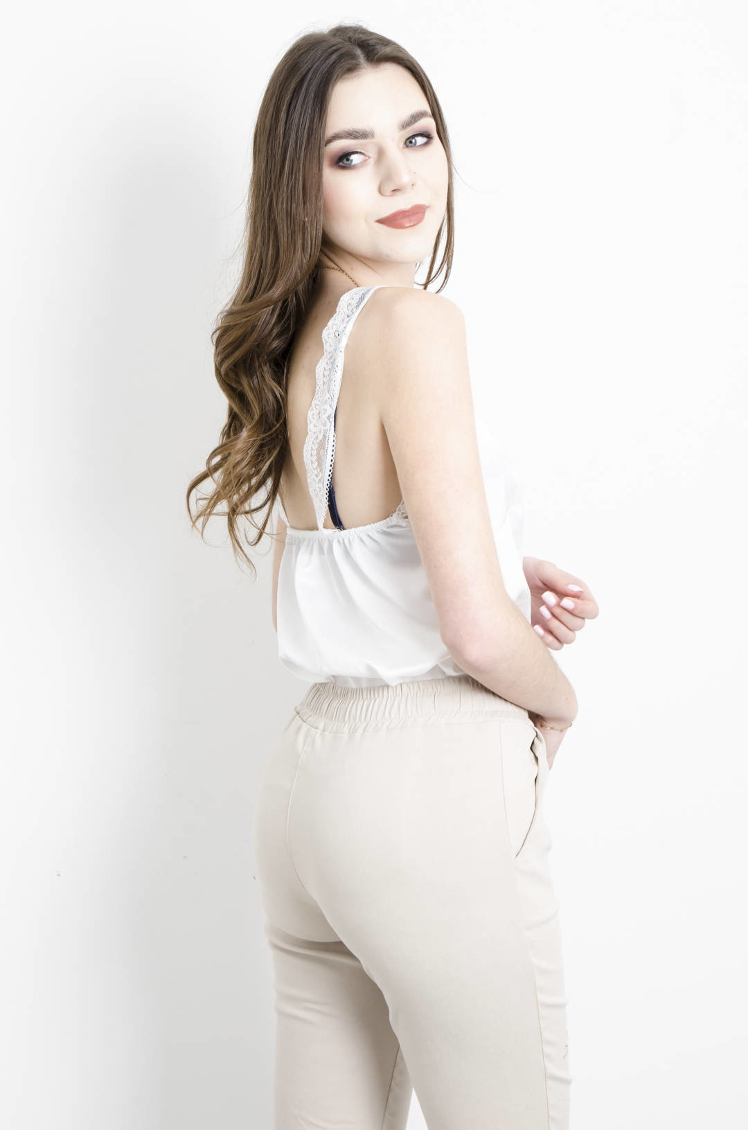 SATYNOWY TOP NA RAMIACZKACH WYKOŃCZONY KORONKĄ - BIAŁY