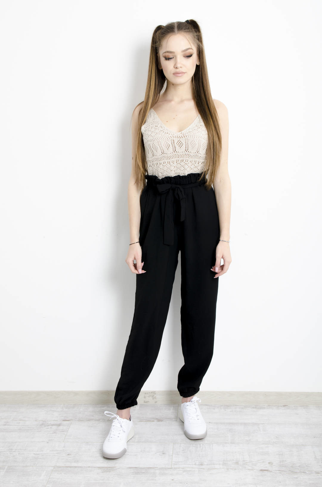 SPODNIE MATRIAŁOWE WIĄZANE W PASIE CZARNE