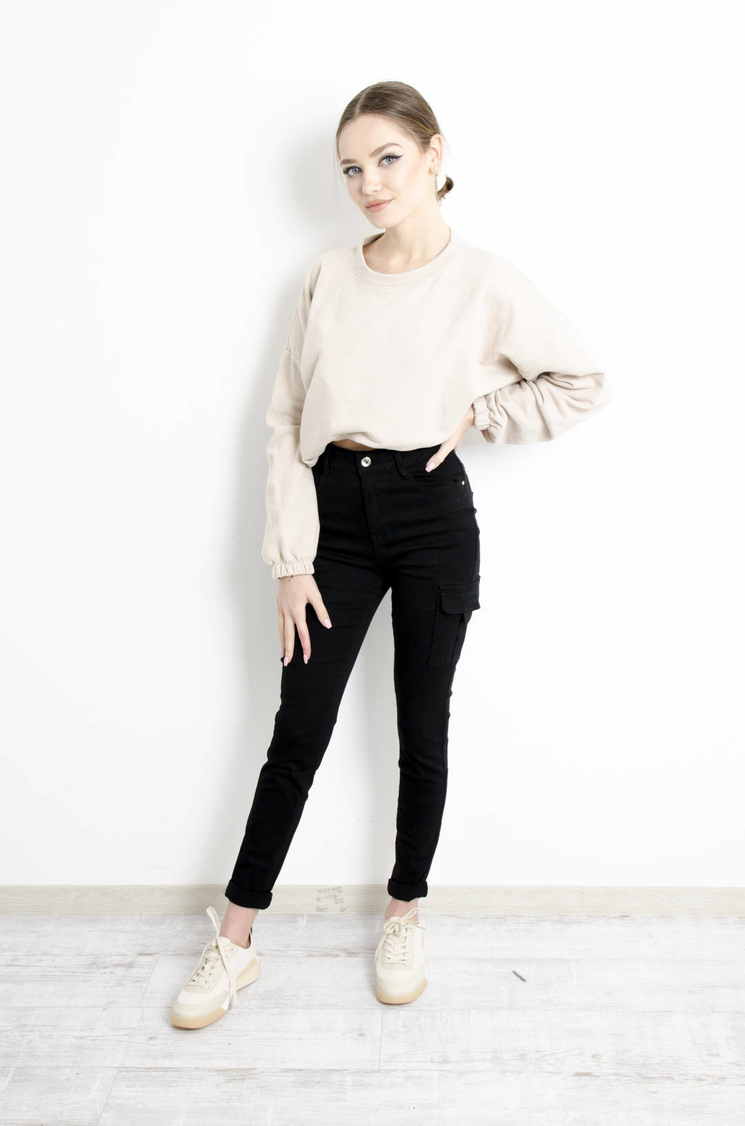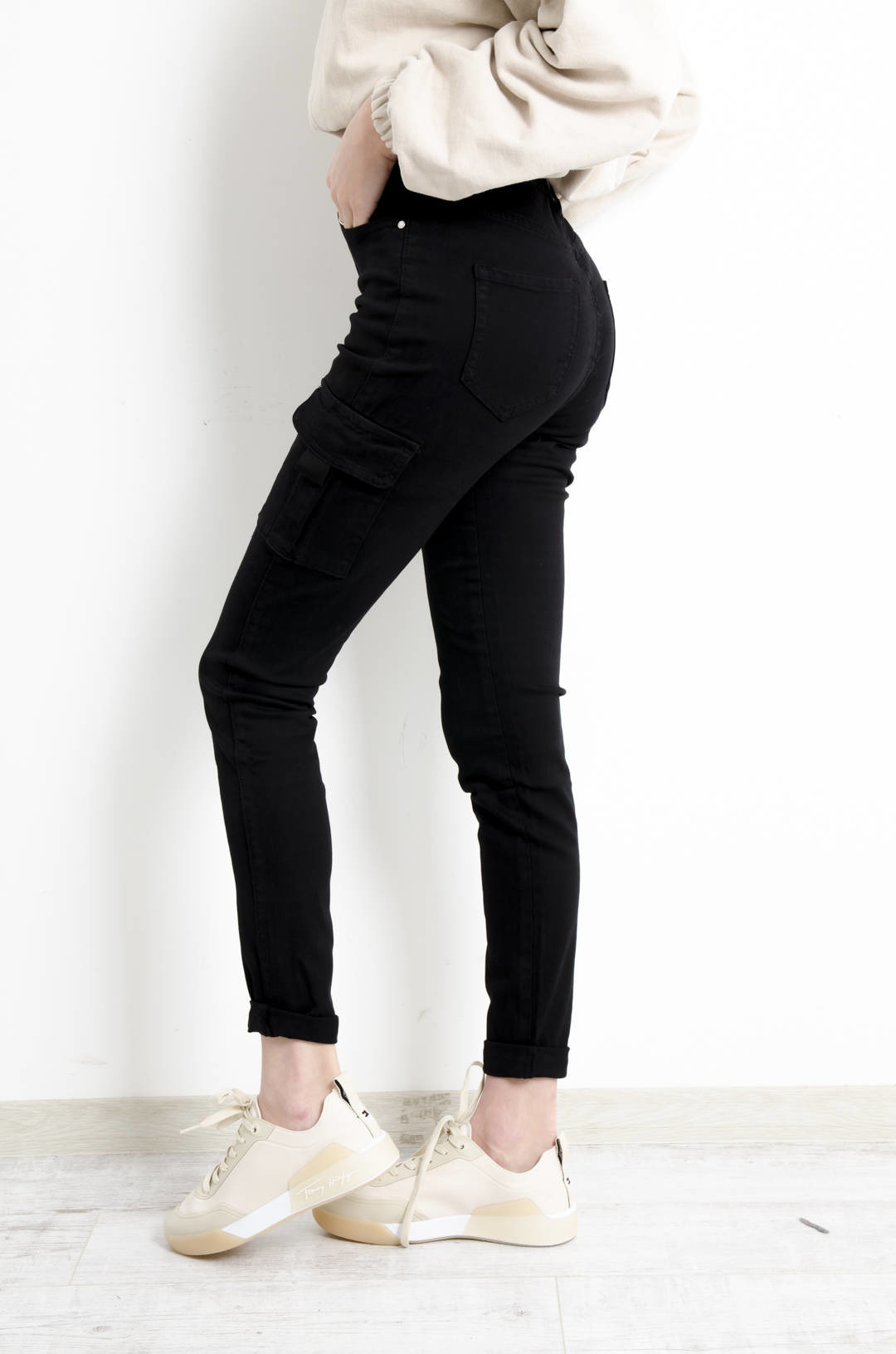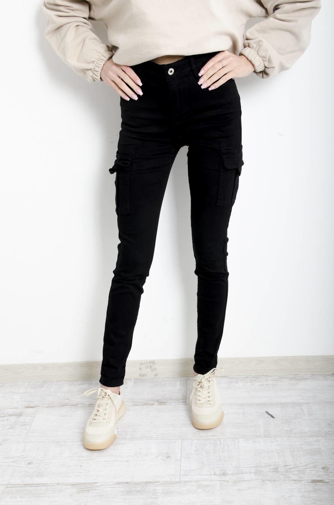 Spodnie bojówki z bawełny. Wysoki stan, rozporek na suwak i guzik. Kieszenie po bokach i z tyłu, na nogawkach kieszenie z klapką.