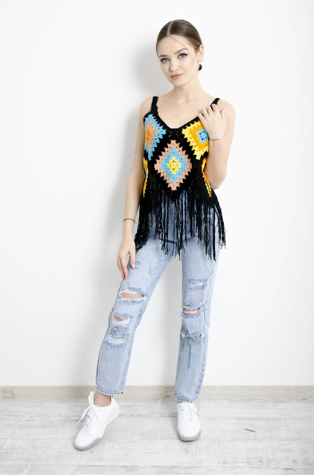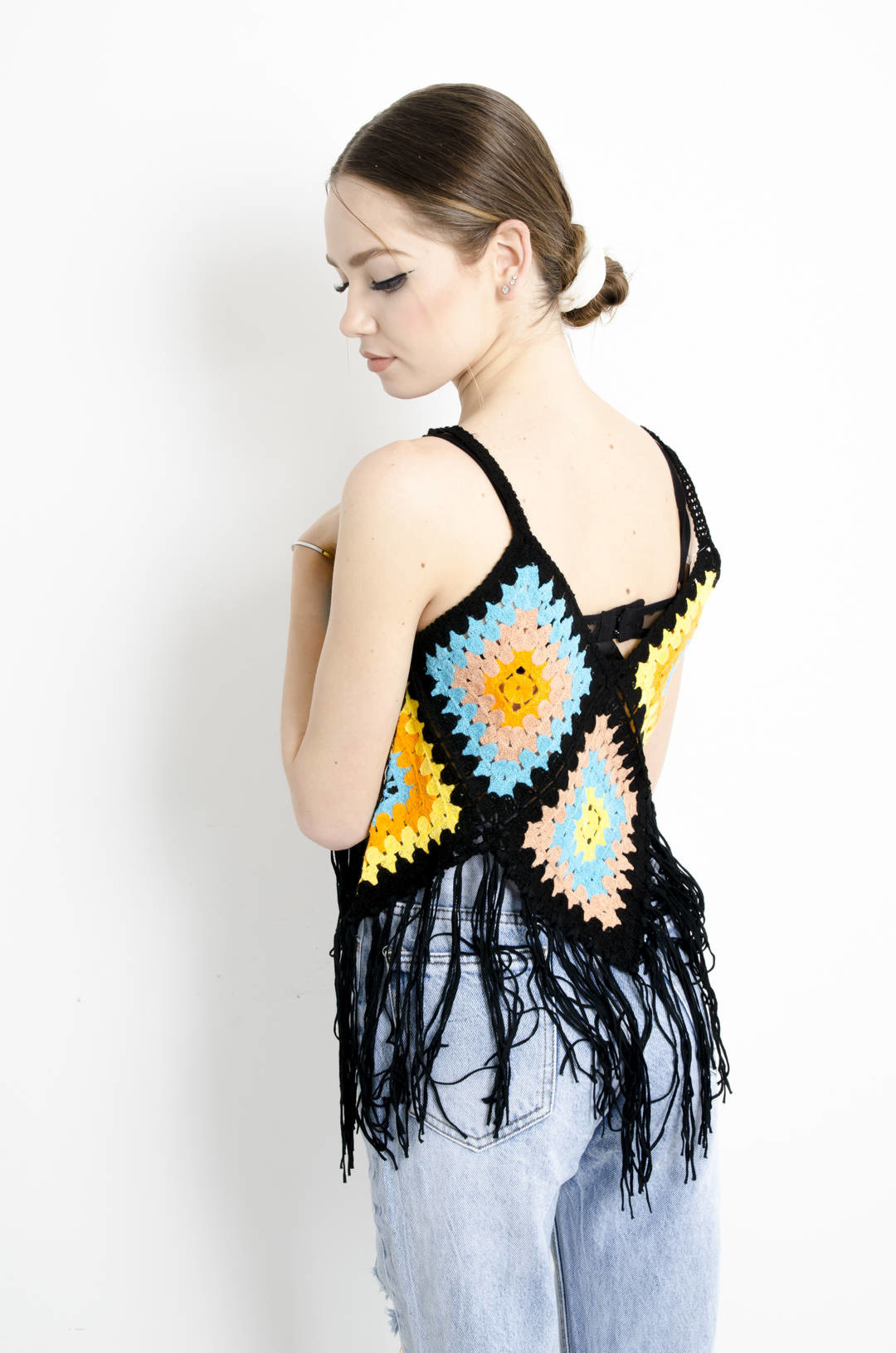 BLUZKA AŻUROWA NA RAMIĄCZKA Z FRĘDZLAMI - CZARNA
