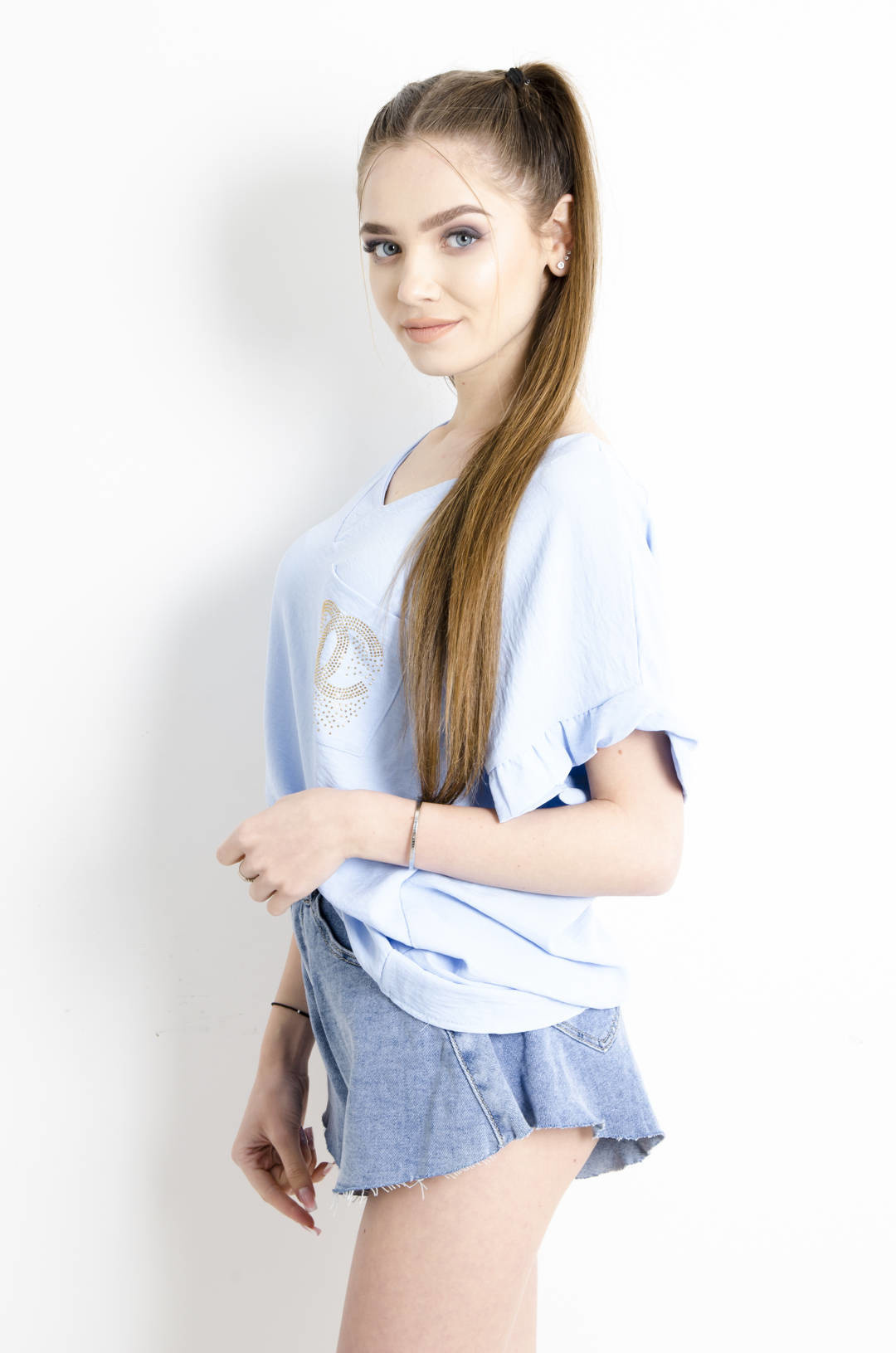 T-SHIRT Z OZDOBNYM ŁAŃCUSZKIEM I FALBANKAMI PRZY RĘKAWACH- NIEBIESKI