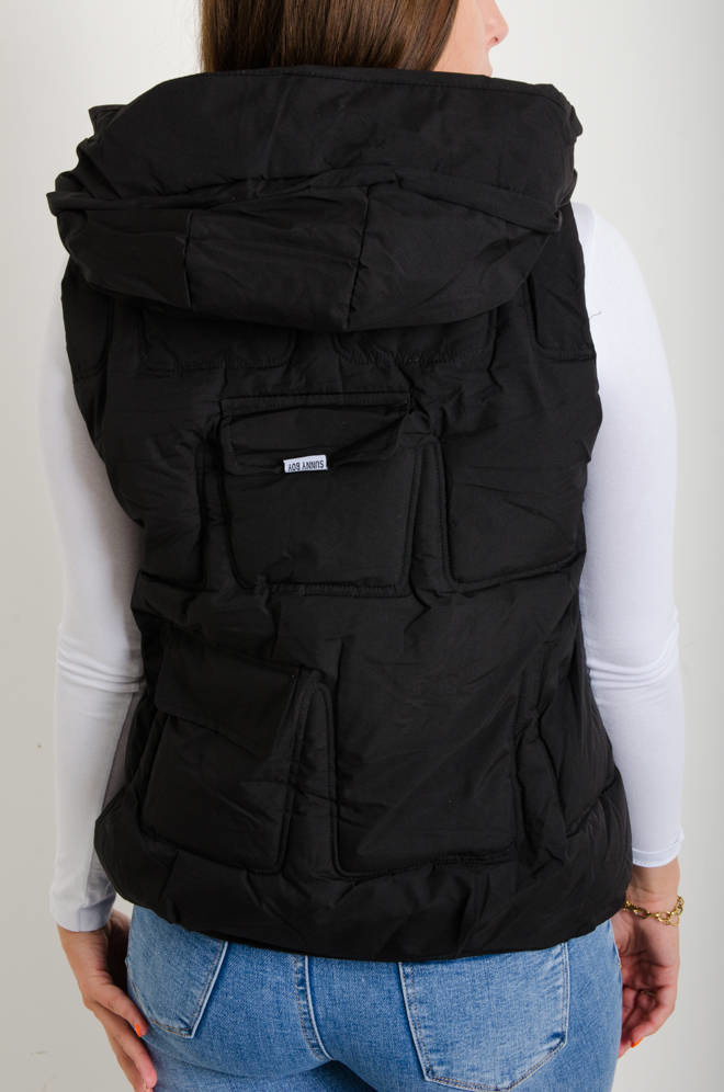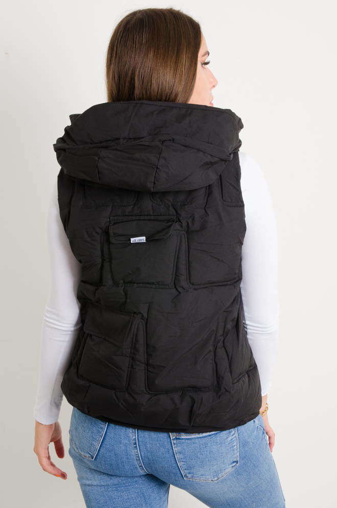 CZARNA KAMIZELKA Z KAPTUREM I KIESZENIĄ