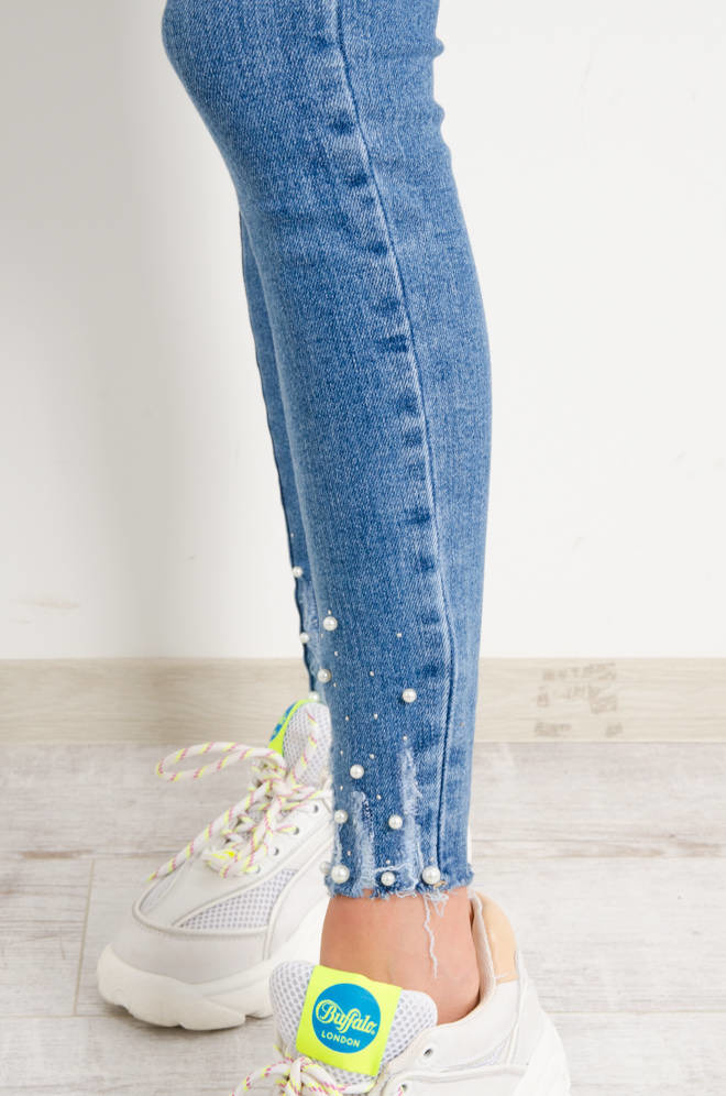 SPODNIE JEANSOWE Z PRZETARCIAMI I OZDOBNYMI PEREŁKAMI PRZY NOGAWCE- WYSOKI STAN