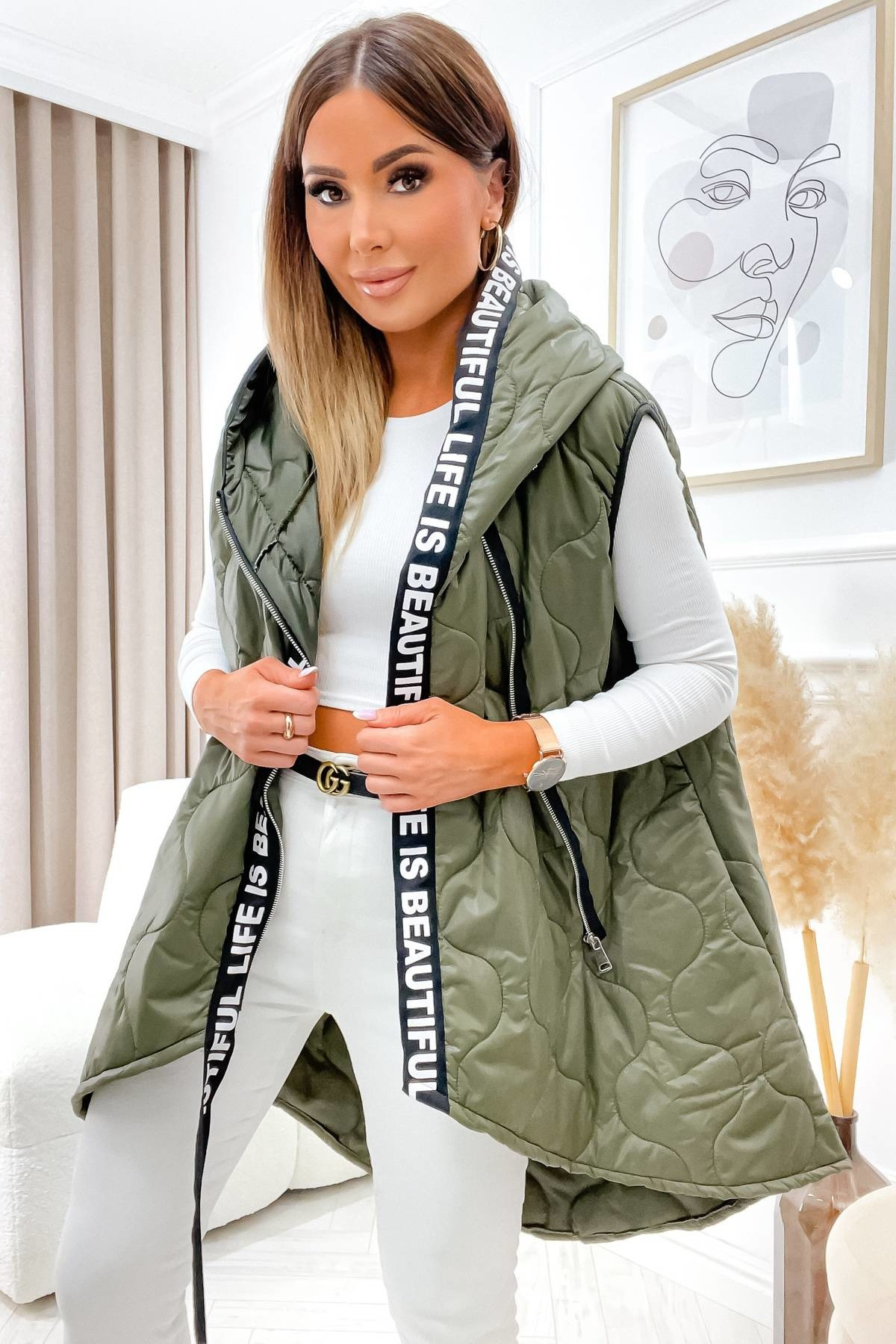 ZIELONA PIKOWANA KAMIZELKA Z OZDOBNYM PASEM