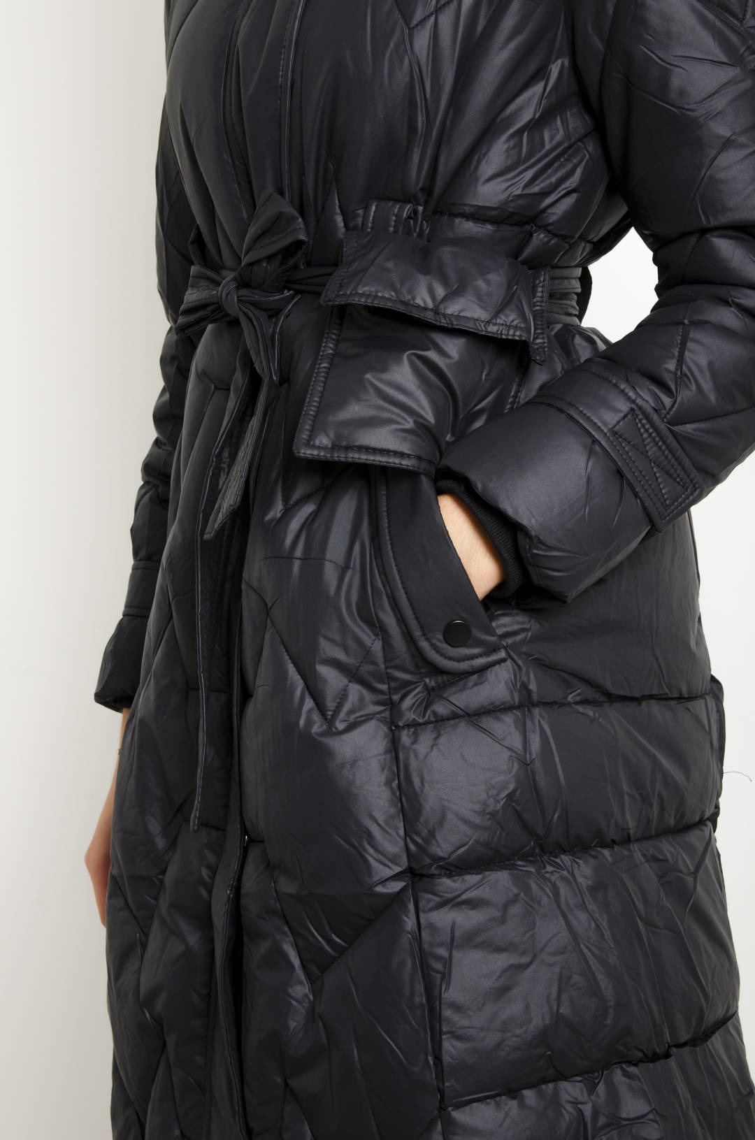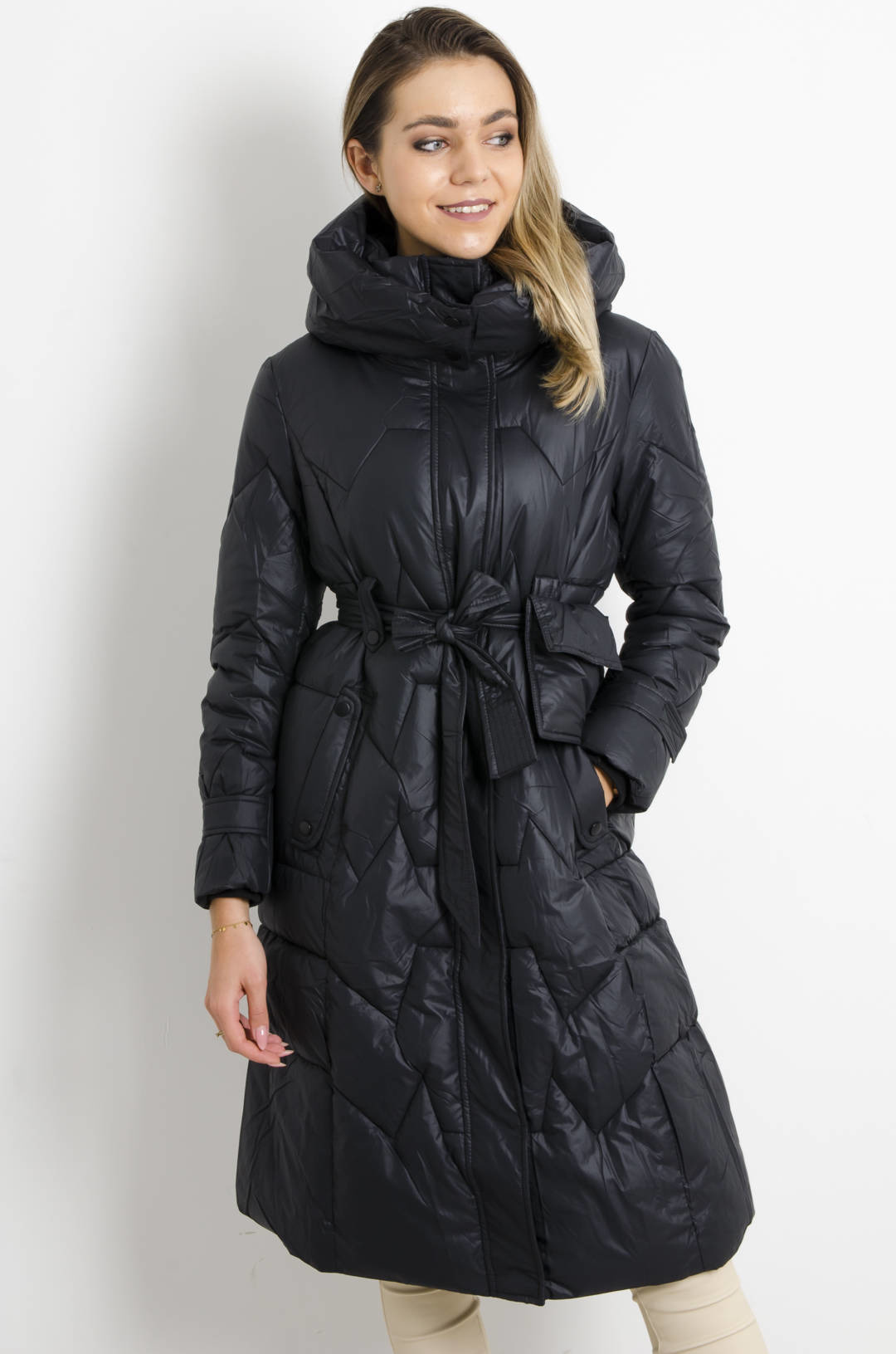 DŁUGA PIKOWANA KURTKA WIĄZANA W PASIE- CZARNA