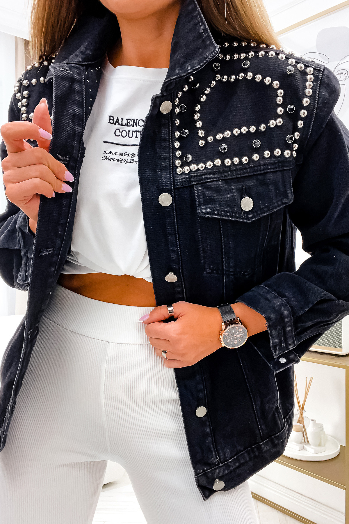 CZARNA KURTKA JEANSOWA Z OZDOBNYMI DŻETAMI I FRĘDZLAMI