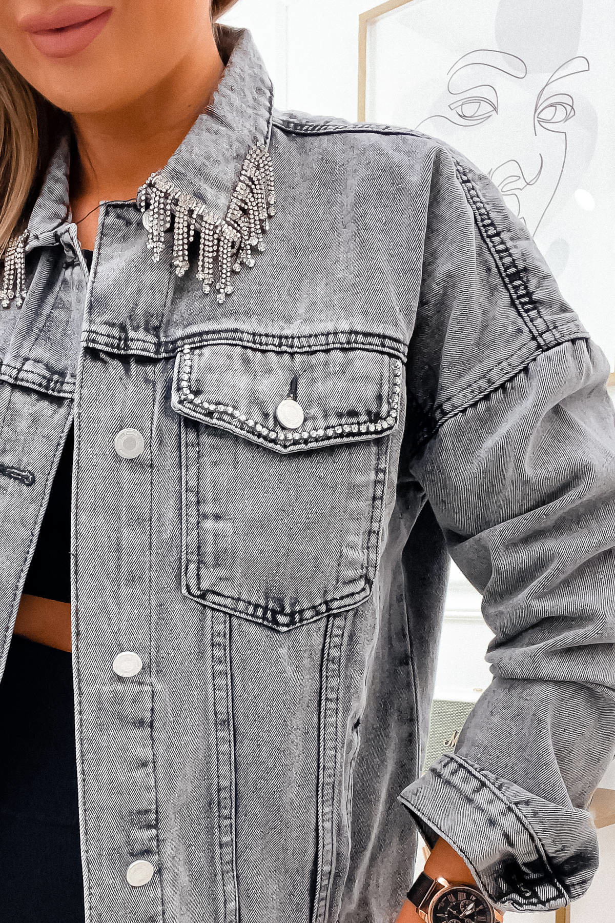 SZARA KURTKA JEANSOWA Z OZDOBNYM KOŁNIERZEM I KIESZENIAMI