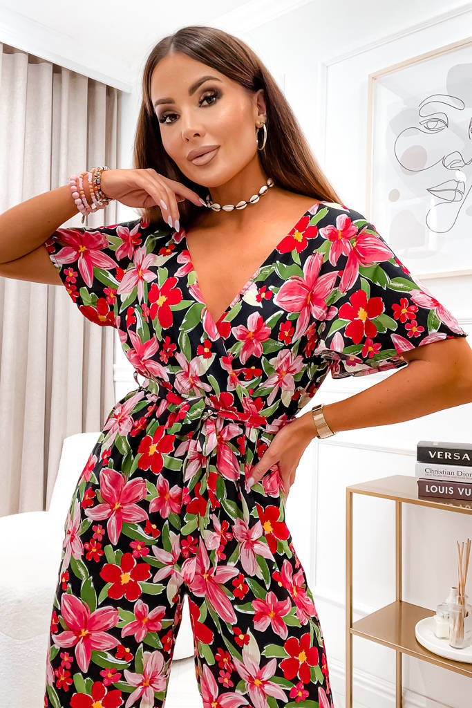 KOMBINEZON W KWIATY Z WIĄZANIEM W PASIE- CZARNY