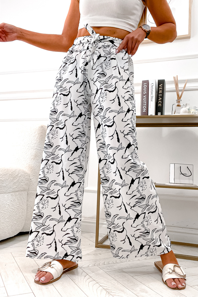 WZORZYSTE SPODNIE Z WIĄZANIEM W PASIE I SZEROKIMI NOGAWKAMI- BIAŁE