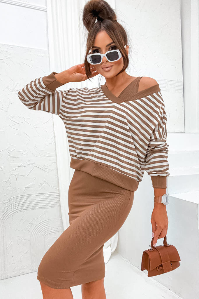 BRĄZOWY KOMPLET SUKIENKA+ BLUZKA W PASKI