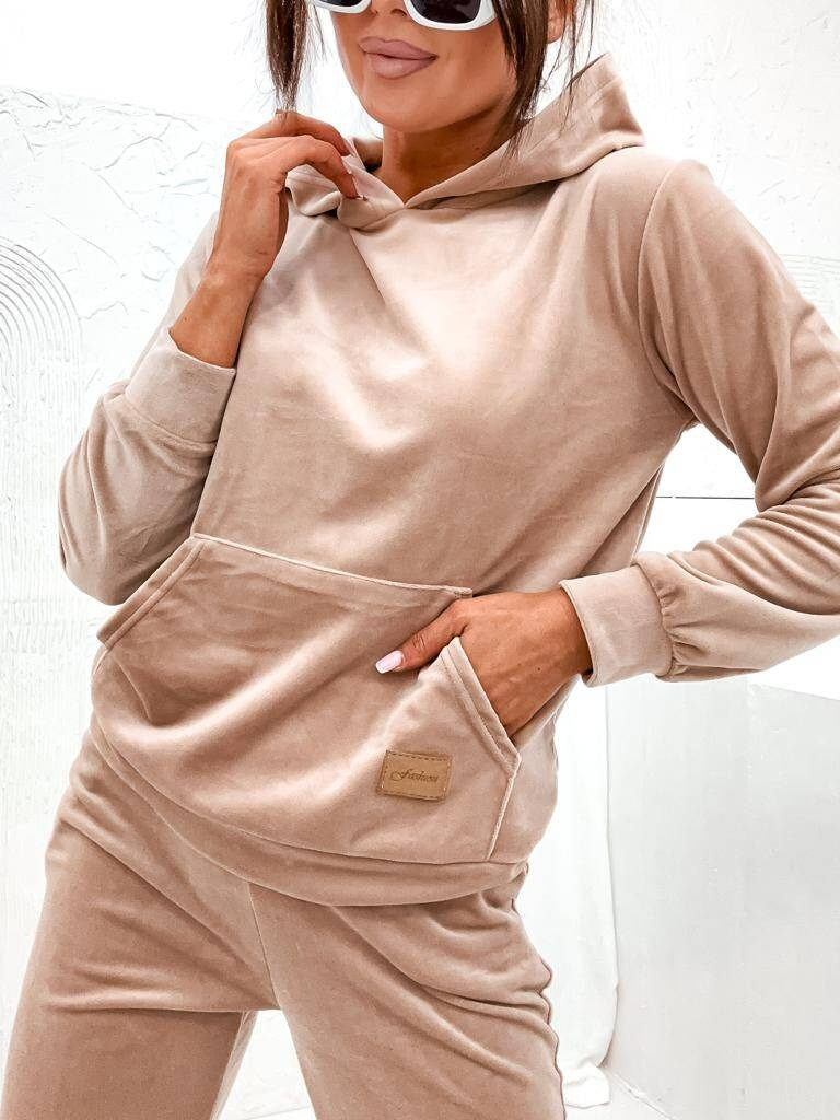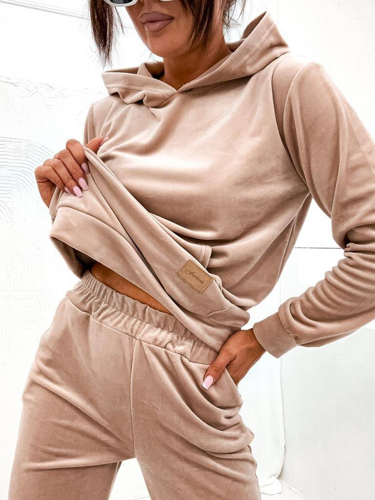 WELUROWY KOMPLET DRESOWY SPODNIE+ BLUZA Z KAPTUREM- BEŻOWY