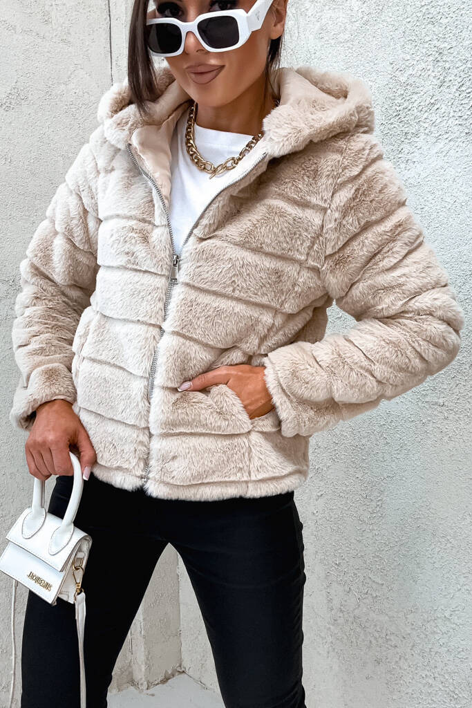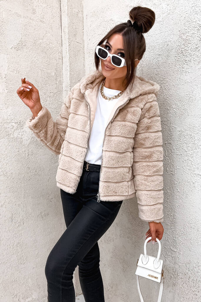 BEŻOWA FUTRZANA KURTKA Z KAPTUREM