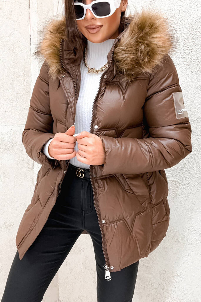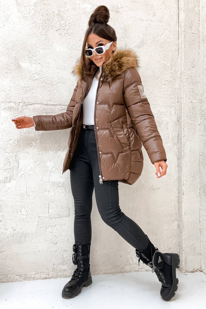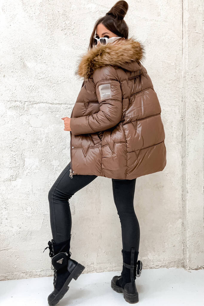 CIEMNO BRĄZOWA KURTKA PIKOWANA Z NASZYWKĄ NA RĘKAWIE
