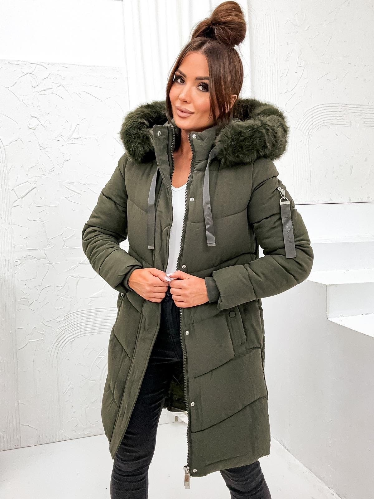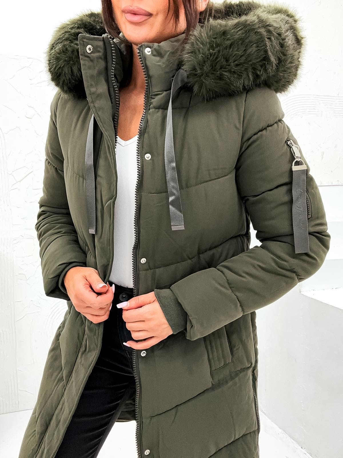 DŁUGA KURTKA Z ZAMKAMI PO BOKACH I FUTRZANYM KAPTUREM- KHAKI