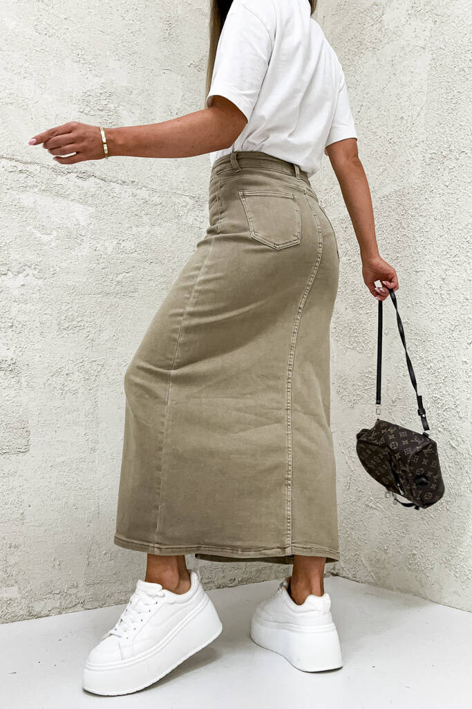 SPÓDNICA JEANSOWE MAXI Z ROZCIĘCIEM- BRĄZOWA