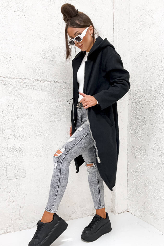 PŁASZCZ POLAROWY Z KAPTUREM I ŚCIAGACZEM W PASIE- CZARNY