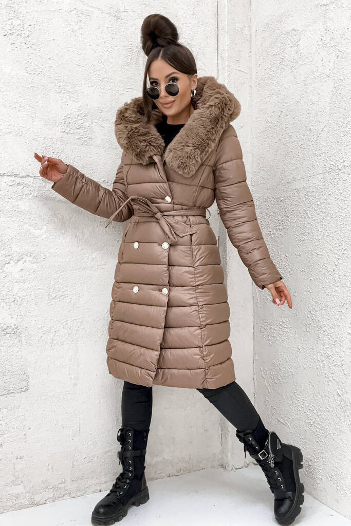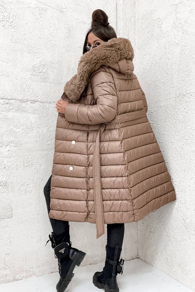 PIKOWANY PŁASZCZ ZE ZŁOTYMI GUZIKAMI I PASKIEM- JASNY BRĄZ