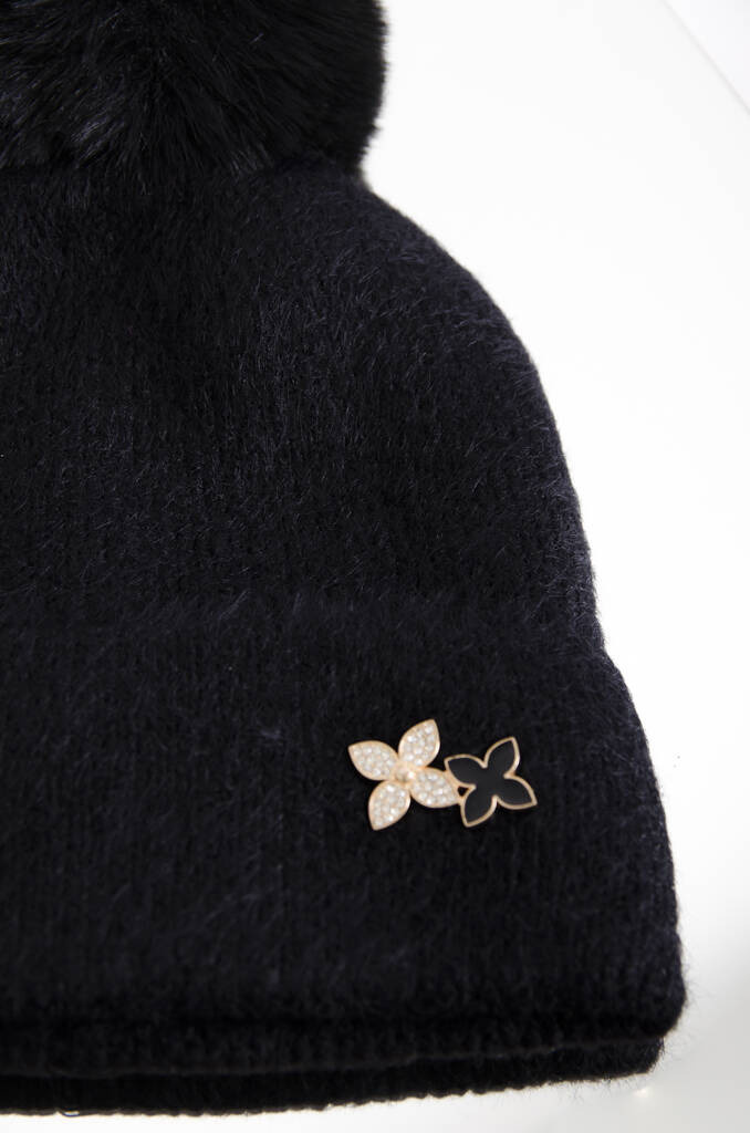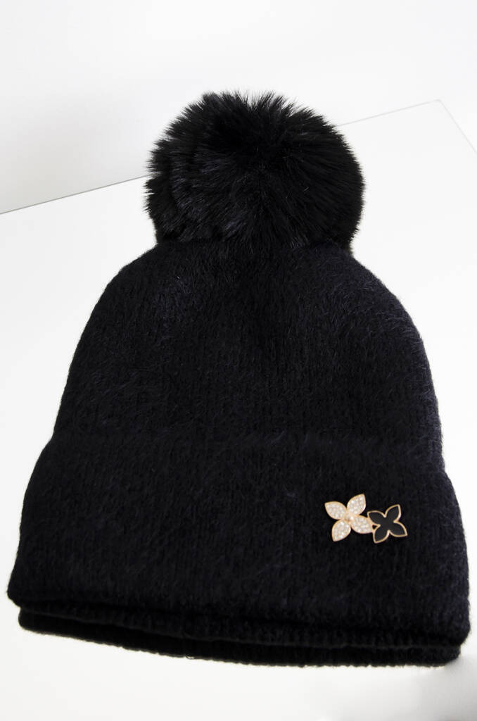 ZIMOWA CZAPKA Z POMPONEM I OZDOBNYM KWIATKIEM- CZARNA