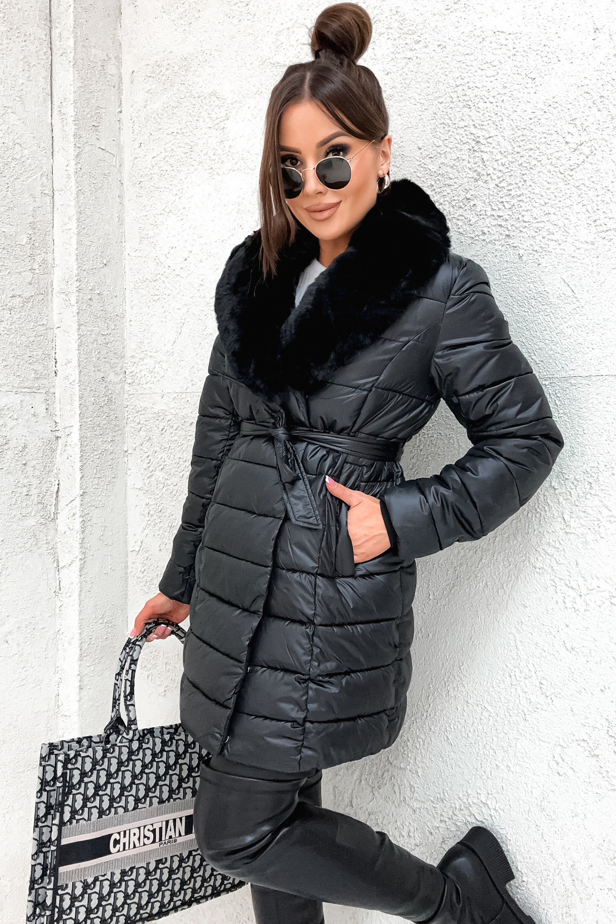 KURTKA WIĄZANA W PASIE Z FUTRZANYM KOŁNIERZEM- CZARNA
