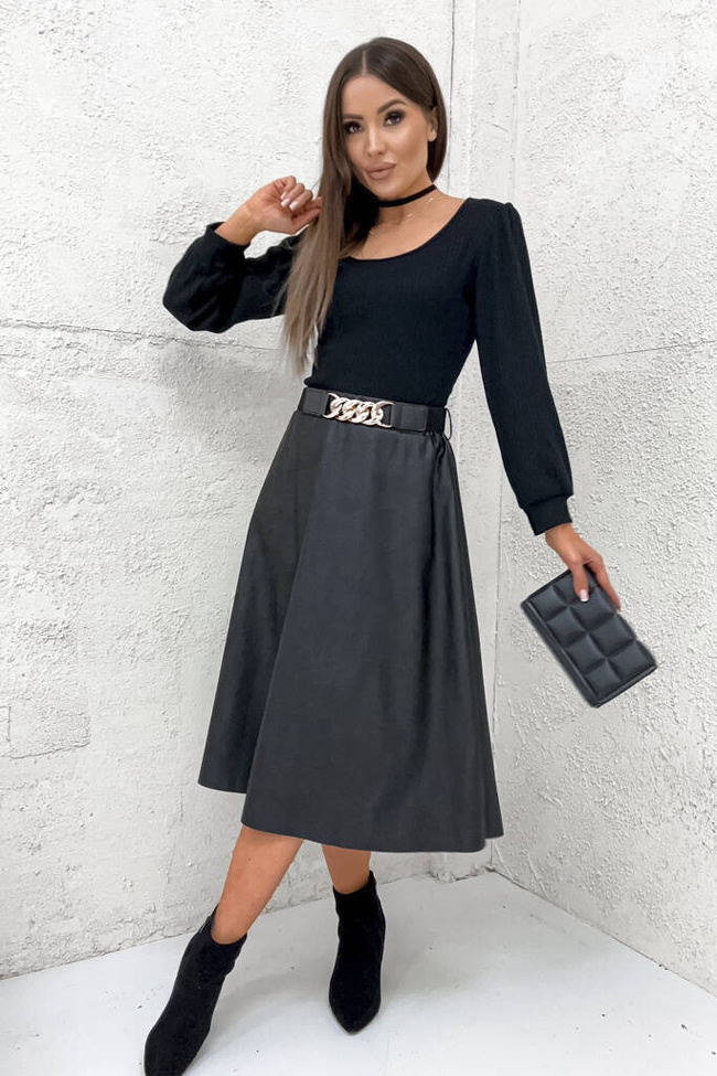 ROZKLOSZOWANA SPÓDNICA Z IMITYACJI SKÓRY + PASEK- CZARNA