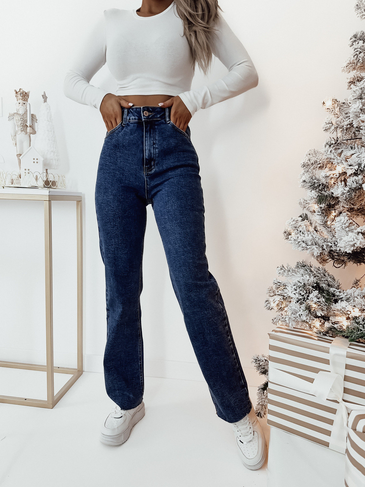 SPODNIE JEANSOWE Z SZEROKĄ NOGAWKĄ I SZARPANIEM- GRANATOWE