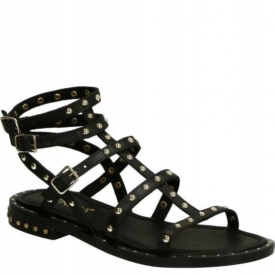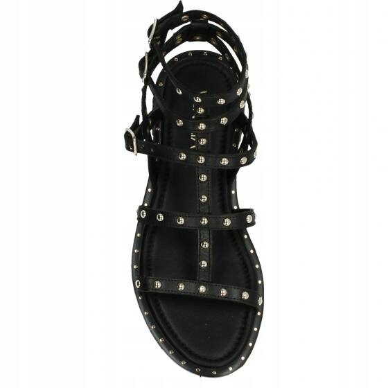 Sandały wykonane ze skóry naturalnej w kolorze czarnym. Wygodna, płaska podeszwa, Ozdobione kompozycją ze złotych nitów. Regulowane paski umieszczone na linii kostki. Skórzana wyściółka zapewni komfort podczas użytkowania.