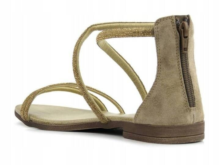 Złote sandały damskie wykonane ze skóry cielęcej. Kryty zapiętek z wygodnym suwakiem zapewnia stabilizację dla stopy. Skórzana wkładka podbita miękką gąbką zapewni niebywały komfort użytkowania. Ciekawe połączenie połyskujących pasków nadaje wyjątkowy design. Model pięknie prezentuje się na nodze i doskonale uzupełnia każdą stylizację.