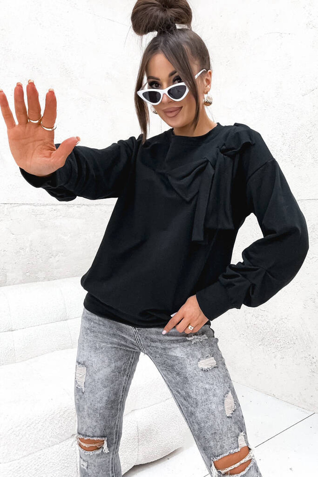 BLUZA Z OZDOBNĄ KOKARDĄ I MARSZCZENIAMI NA RĘKAWACH- CZARNA