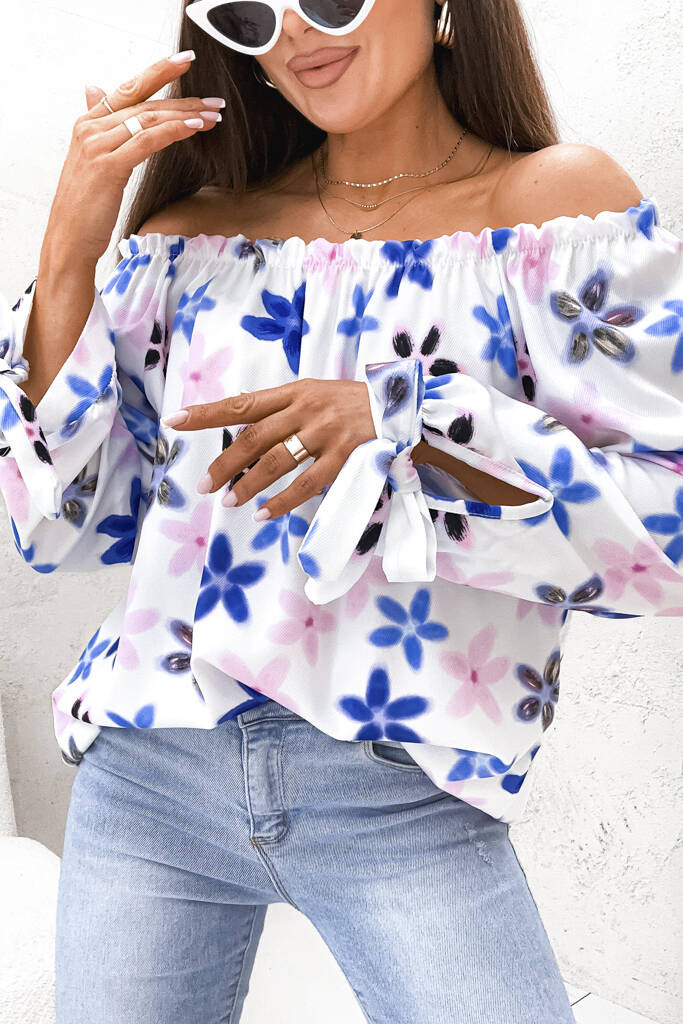 BLUZKA HISZPANKA W KWIATY Z WIĄZANIEM NA RĘKAWACH- BIAŁA