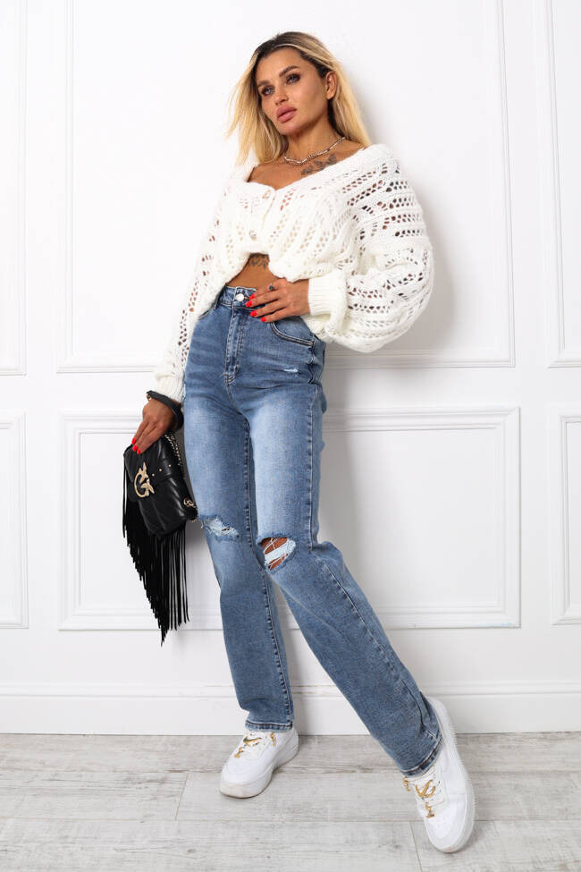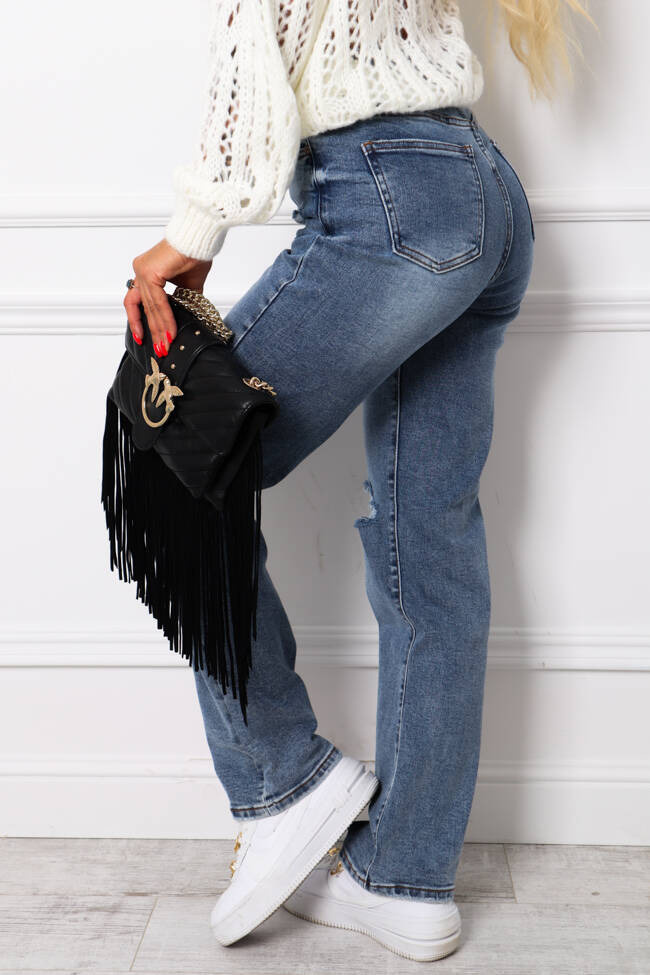 SPODNIE JEANSOWE Z PROSTĄ NOGAWKĄ I DZIURAMI- NIEBIESKIE