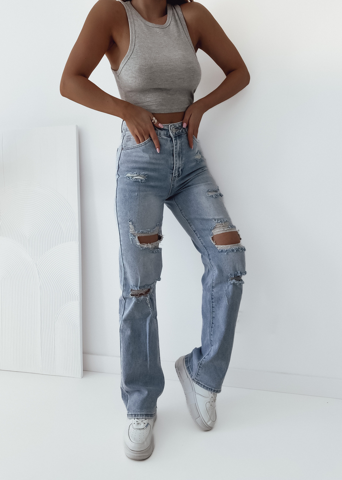SPODNIE JEANSOWE Z SZEROKIMI NOGAWKAMI I PRZETARCIAMI